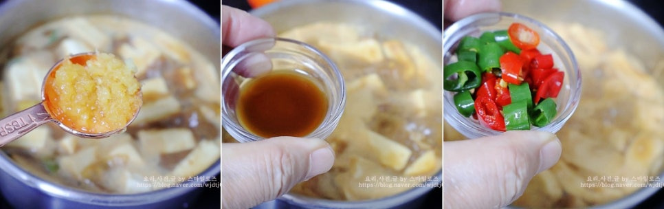 간을 보고 싱거워 참치 액을 1큰술 넣고 청양고추 홍고추를 넣어줍니다