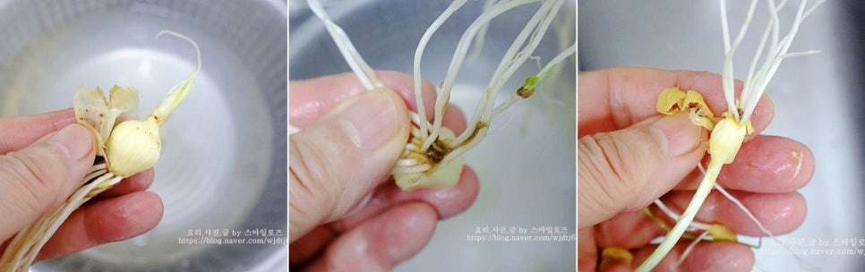 까만 돌기를 손톱으로 떼어내고 지저분한 알뿌리 껍질을 떼어 냅니다