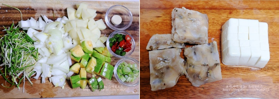 애호박 감자 양파는 먹기 좋은 크기로 썰고 두부도 먹기 좋게 썰고