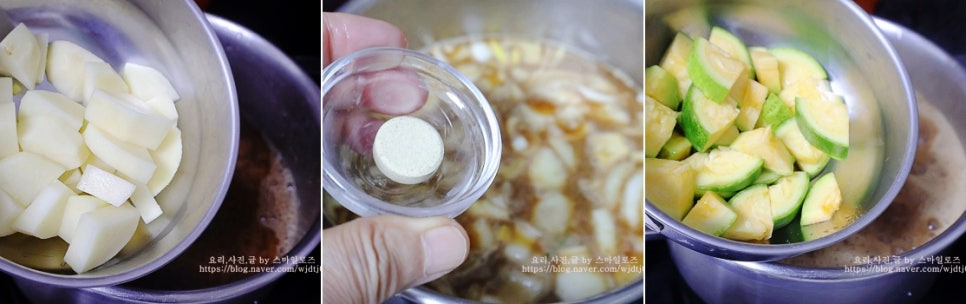 된장 풀어놓은 냄비에 딱딱한 감자부터 넣고
