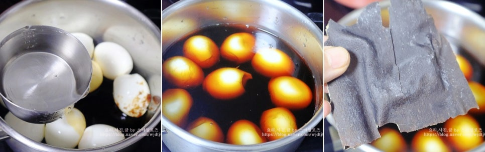 냄비에 계란을 넣고 진간장 4큰술, 흑설탕 1큰술 맛술 1큰술을 넣고