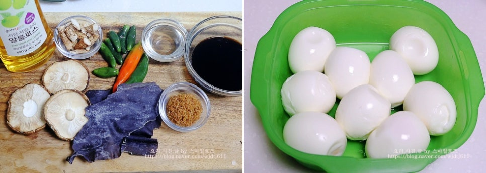 계란 껍데기를 벗겨 놓고 계란장조림 만들 재료를 준비했어요