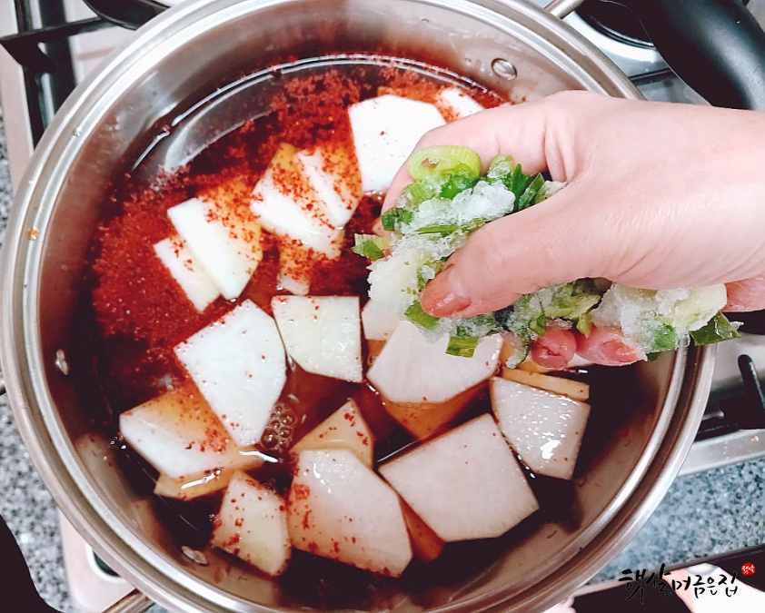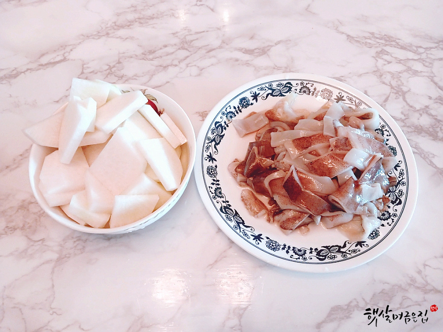 오징어2마리.무 반개.육수 700ml.국간장2T.간마늘1t.고춧가루1T.고추장1t.파 한움큼.소금 1t.