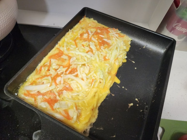 양배추는 채썰어서. 계란 지단물에 섞어서 사용. (당근도 있다면 채썰어 같이 넣고 계란지단 만들면 굿굿)