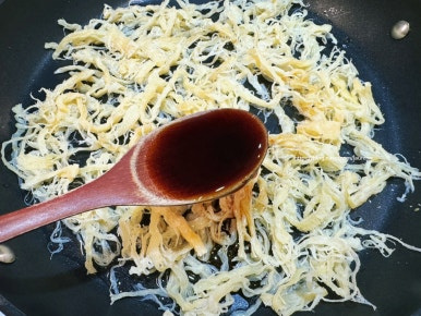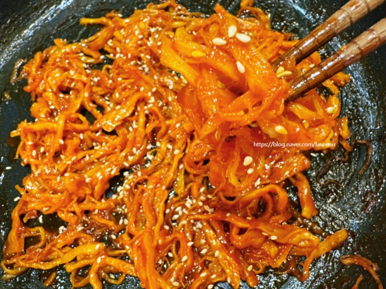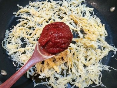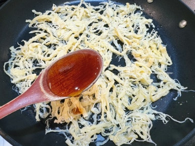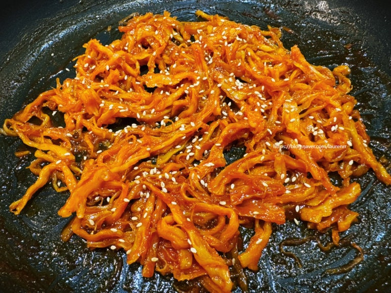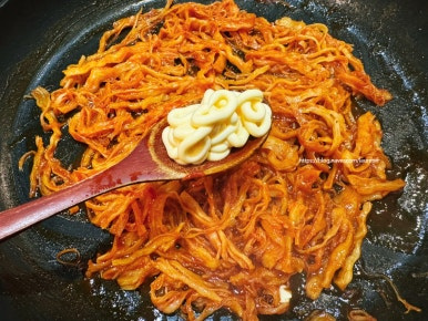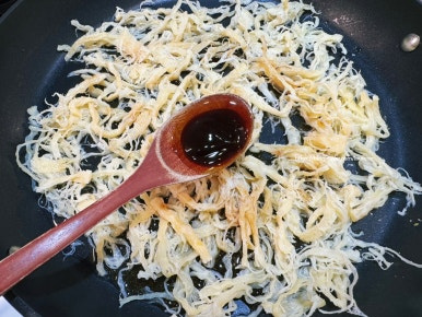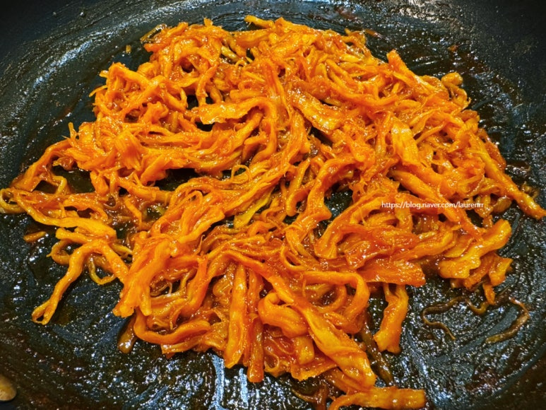 오징어채 160g , 물 조금 , 메이플 시럽 1큰술 , 맛간장 1큰술 , 굴소스 1/2큰술 , 고추장 1.5큰술 , 마요네즈 1.5큰술 , 올리고당 2큰술 , 깨 조금