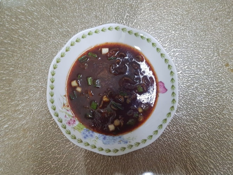 간장 2 큰 술 , 고춧가루 1 큰 술 , 육수 1 큰 술 , 올리고당 1 큰 술 , 후추 1 큰 술 , 매실액 1 큰 술 , 대파 1/3 대 , 통깨 1 큰 술