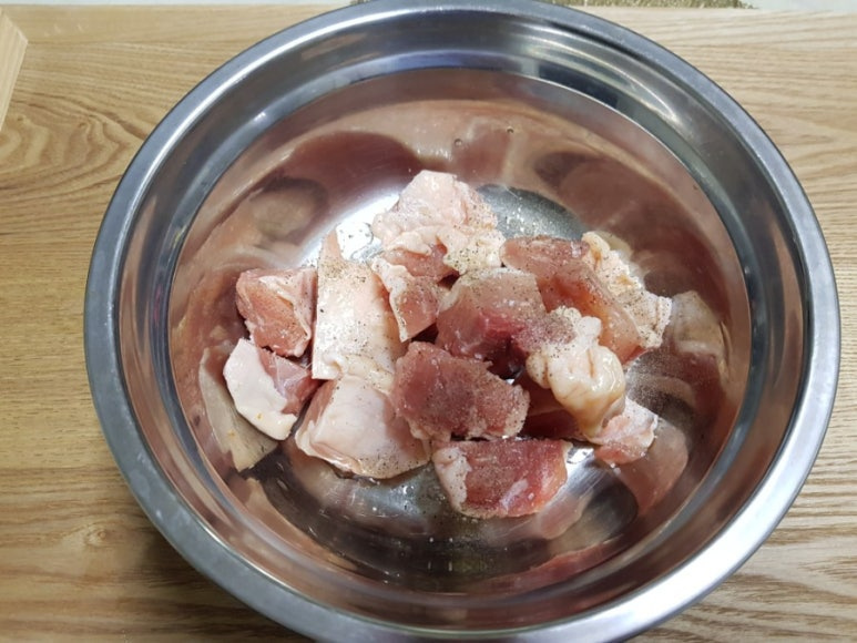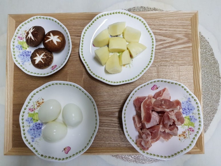 닭다리살 200 g , 표고버섯 2~3 개 , 달걀 3 개 , 감자 1 개 , 소금 약간 , 후추 약간