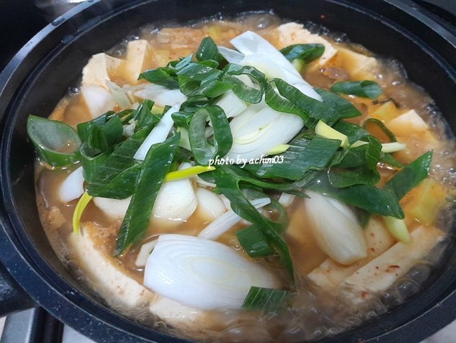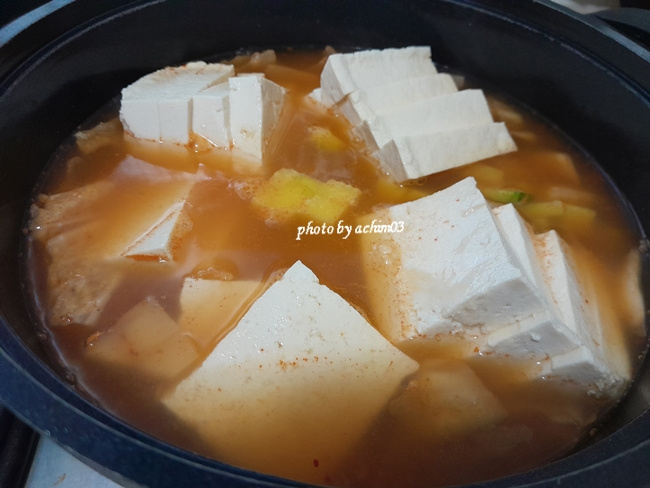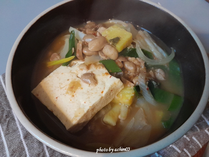 청국장() 200g , 두부 400g , 배추김치() 3잎 , 애호박() 1/4개 , 양파 1/2개 , 대파 20cm