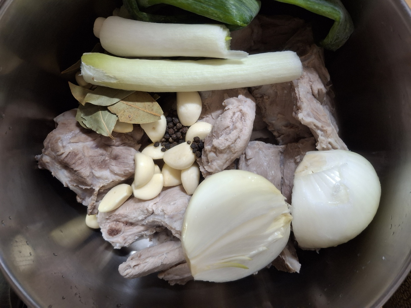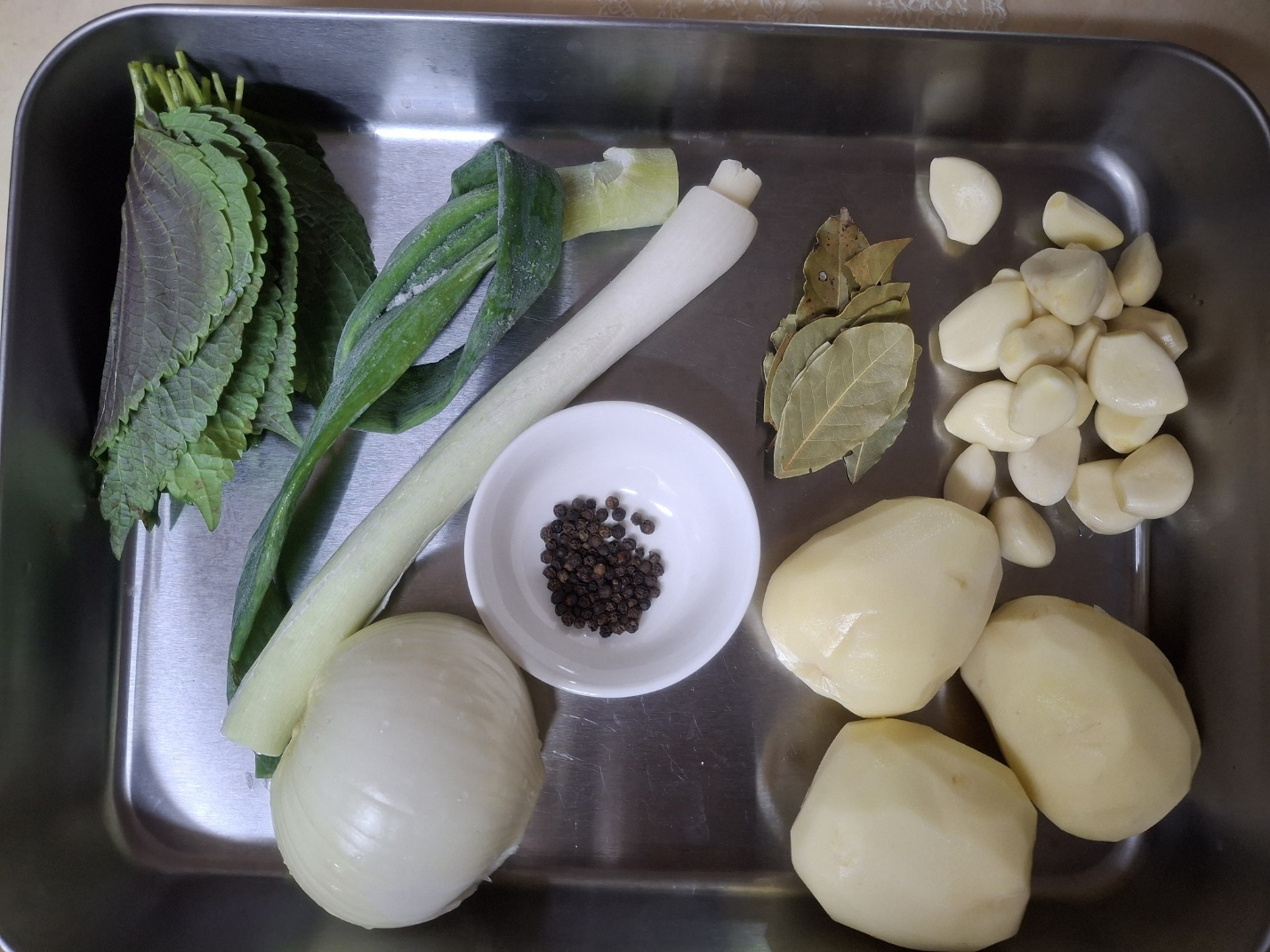 돼지등뼈 2 kg , 맛술 50 ml (5큰술), 우거지 600 g , 감자 3 개 , 양파 200 g , 대파 2 대 , 통마늘 20 개 , 월계수잎 5 장 , 통후추 30 알 , 깻잎 1 묶음 , 들깨가루 3 큰술 (1큰술= 15ml), 멸치 다시마 육수 3 L (3 000ml)