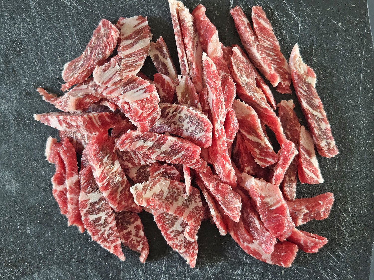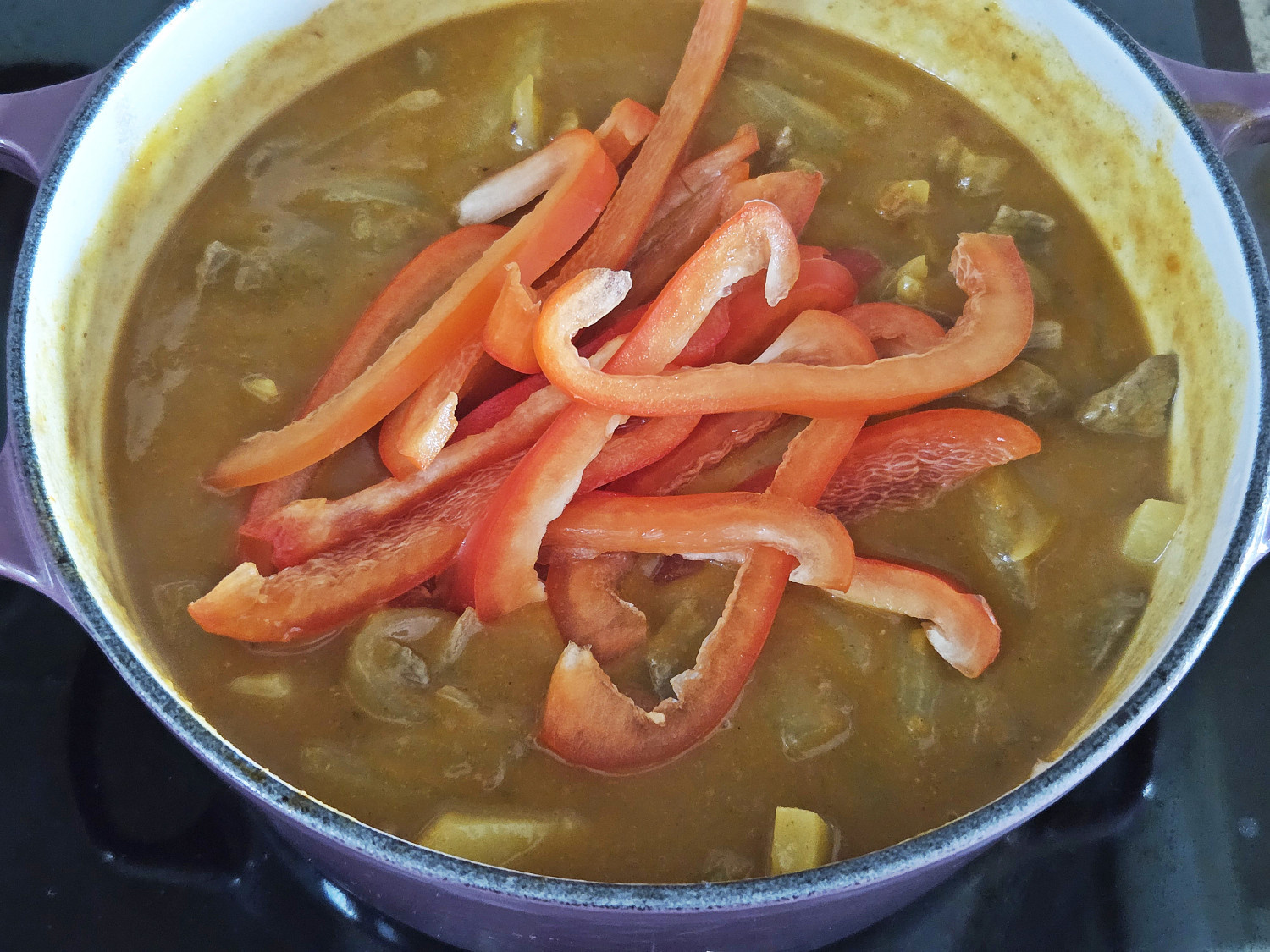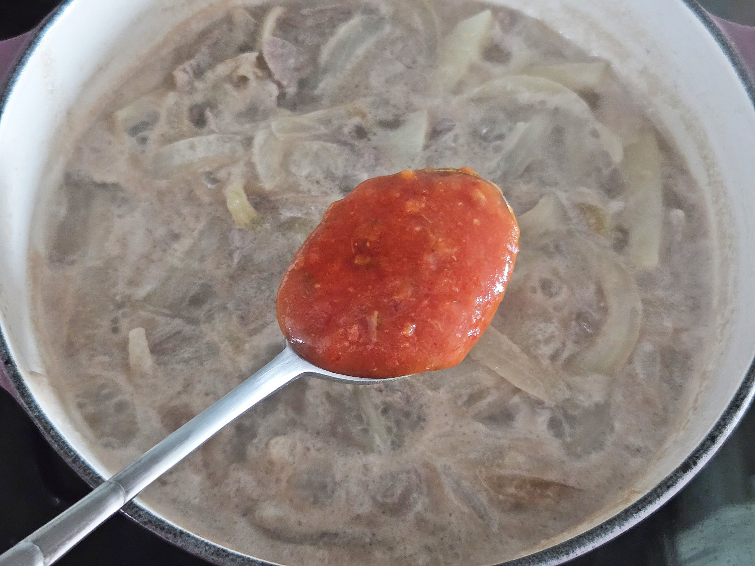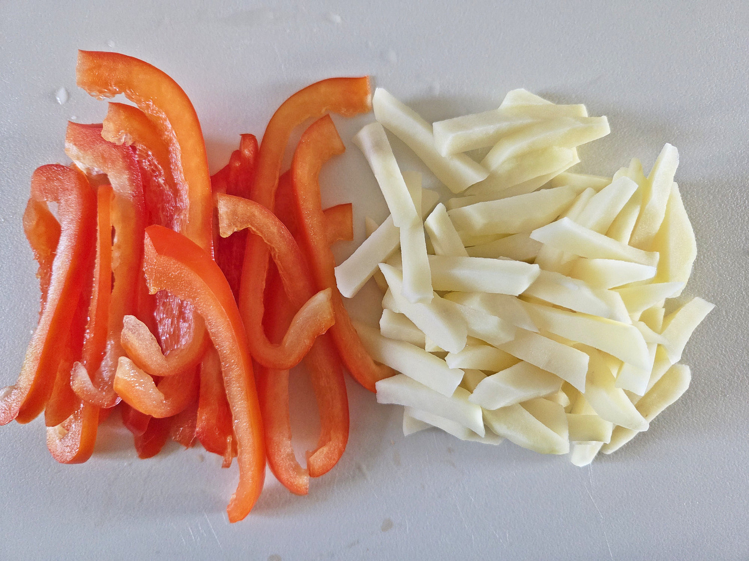 소 등심덧살 130 g , 양파 1 개 (200g), 파프리카 ½ 개 (90g), 감자 1 개 (100g), 식용유 3 큰술 , 물 700 ml , 시판 토마토소스 3 큰술 , 후춧가루 톡톡톡