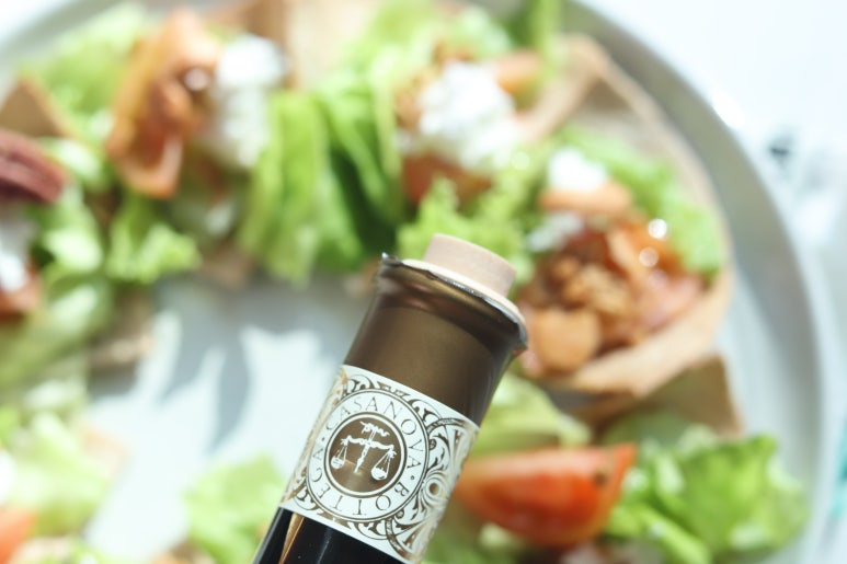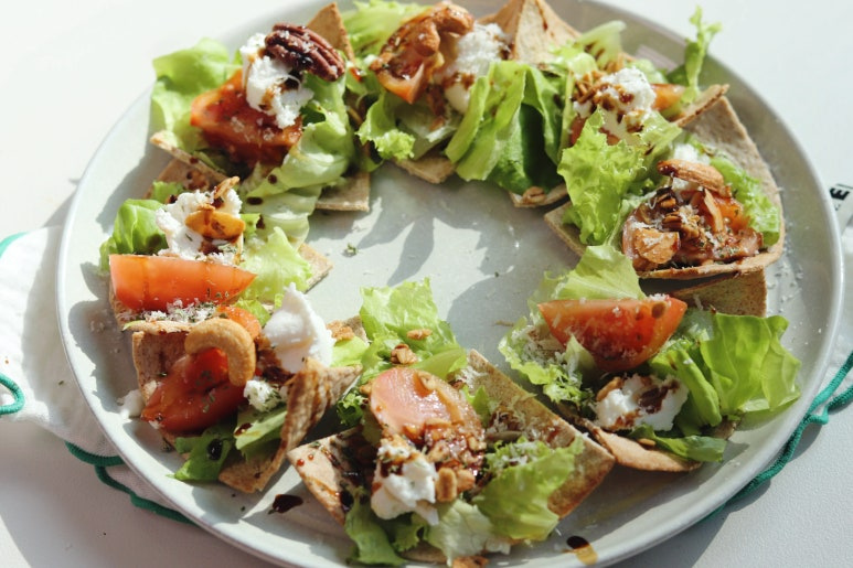 또띠아(8인치) 2장 , 잎채소 약간 , 토마토 1~2개 , 그래놀라(견과류) 1스푼 , 리코타 치즈 1~ 2스푼 , 올리브 오일 1스푼 , 발사믹 1스푼 , 파슬리 가루 약간