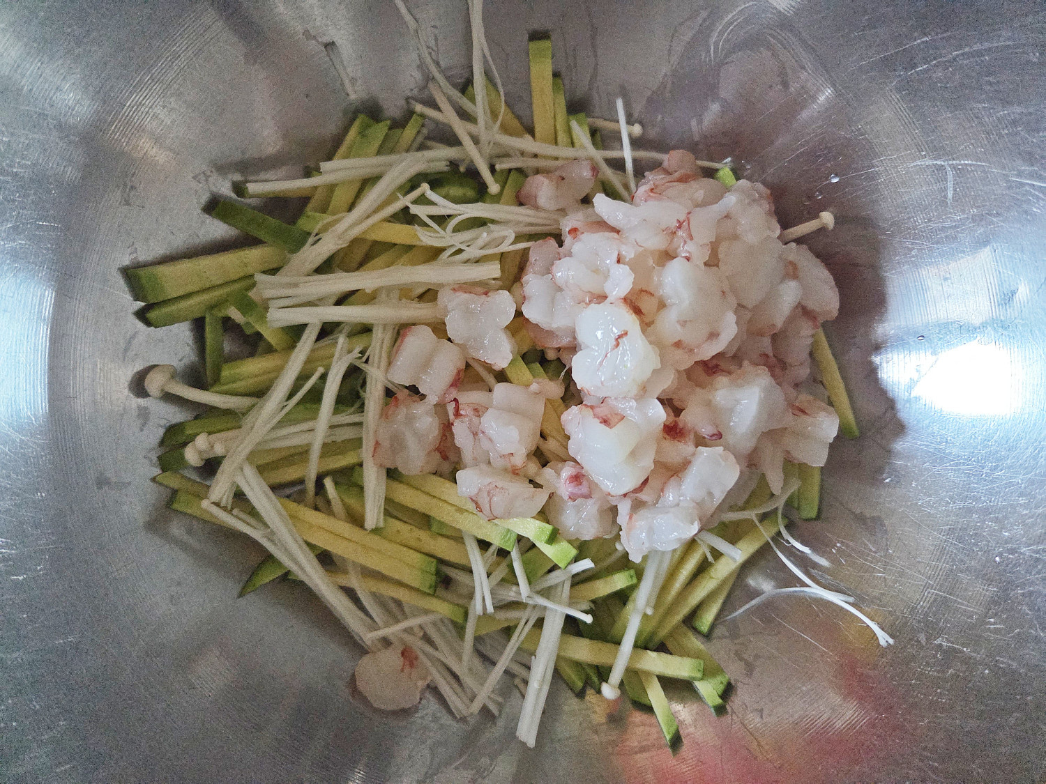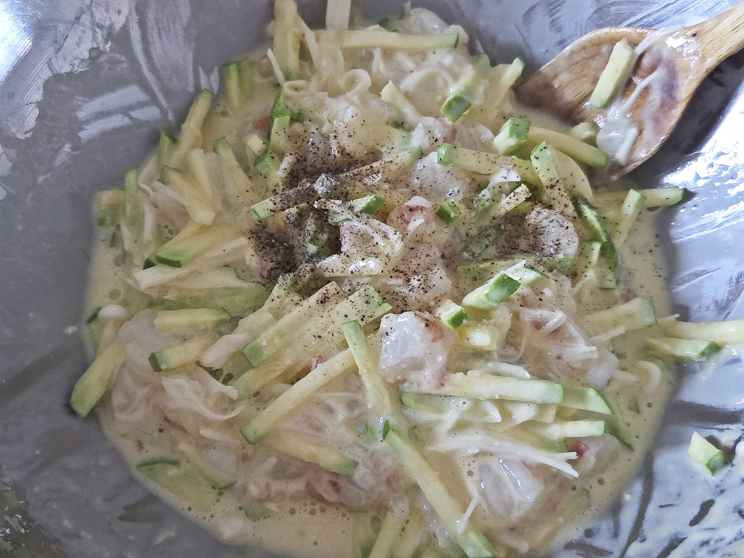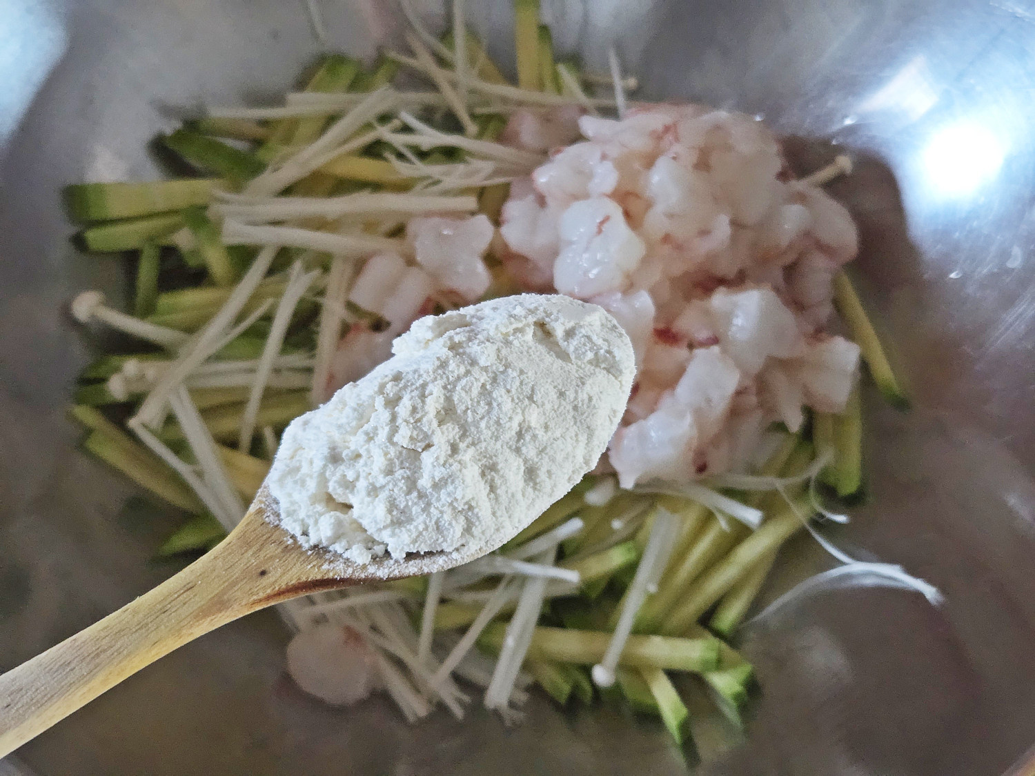 애호박 ½ 개 (약 150g), 냉동 새우 100 g , 팽이버섯 ⅓ 봉지 (小), 부침가루 2 큰술 , 튀김가루 2 큰술 , 찬물 ⅓ 컵 , 달걀 1 개 , 후춧가루 톡톡톡 , 꽃소금 2 꼬집 , 식용유 적당량