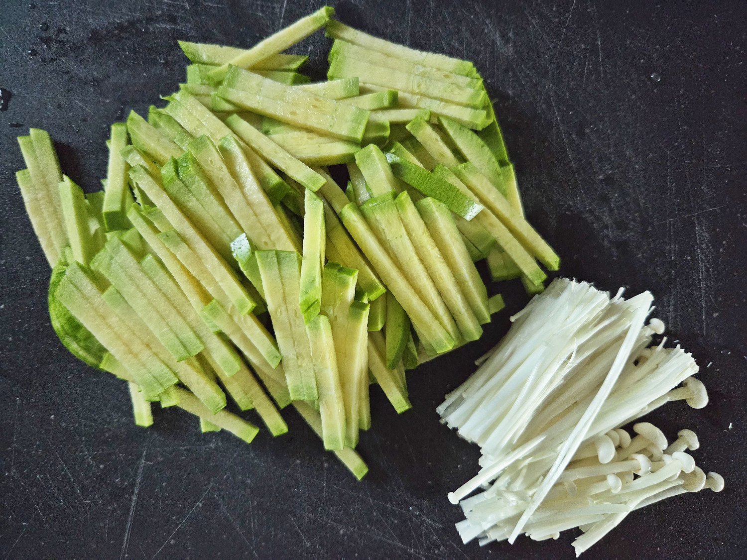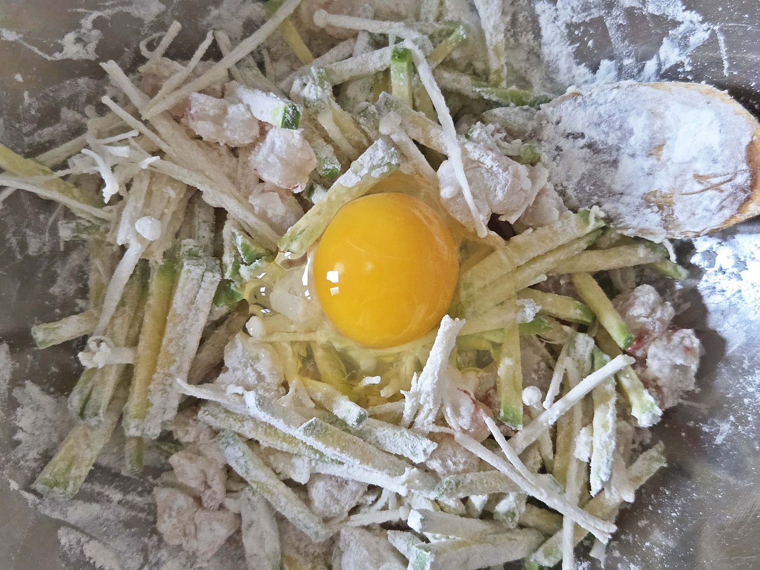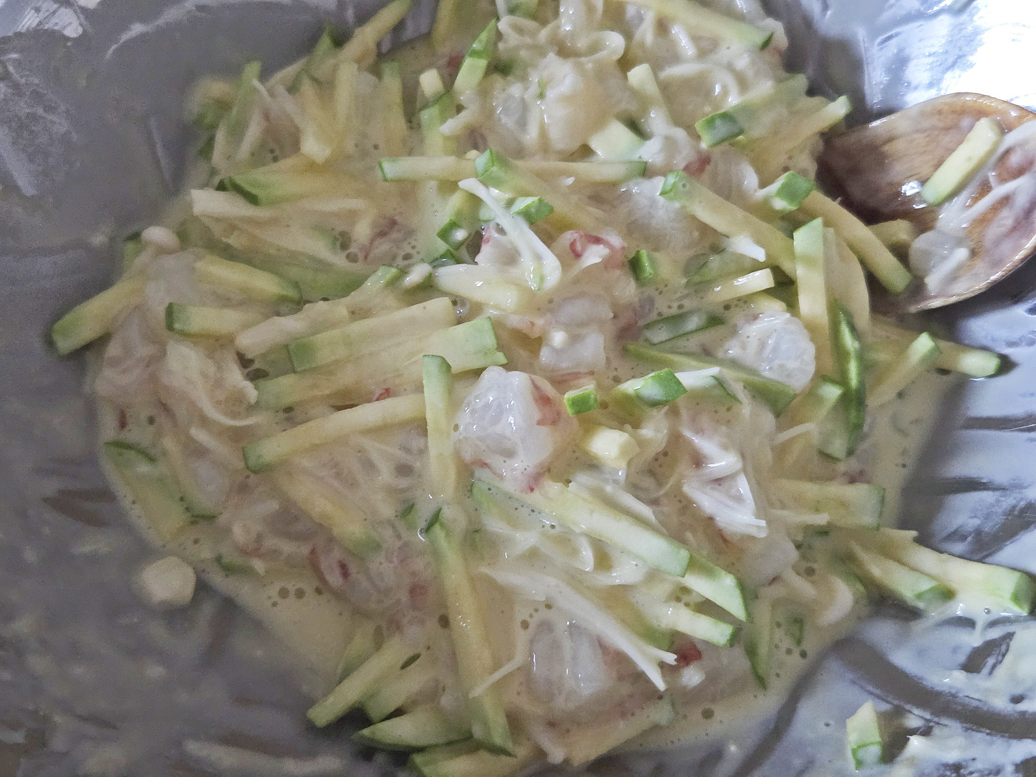 애호박 ½ 개 (약 150g), 냉동 새우 100 g , 팽이버섯 ⅓ 봉지 (小), 부침가루 2 큰술 , 튀김가루 2 큰술 , 찬물 ⅓ 컵 , 달걀 1 개 , 후춧가루 톡톡톡 , 꽃소금 2 꼬집 , 식용유 적당량