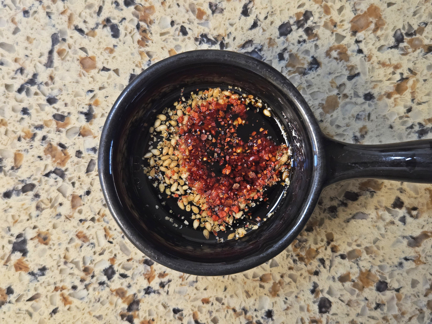 진간장 1 큰술 , 참기름 1 작은술 , 간 깨 약간 , 고춧가루 약간