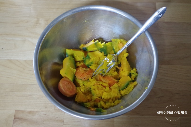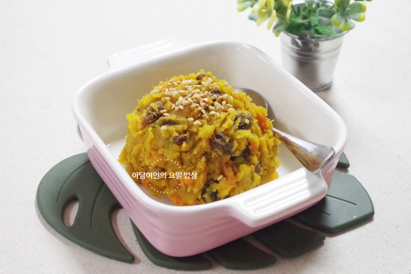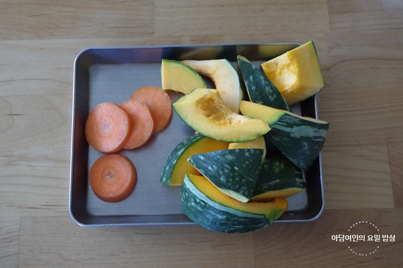 단호박 1/3 통 , 건포토 1/3 컵 , 당근 1/4 개 , 대추야자시럽 2 큰술