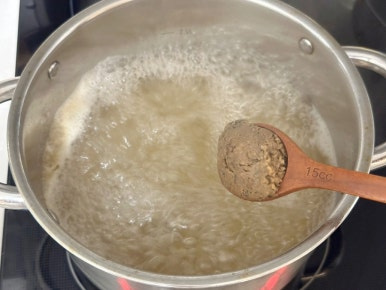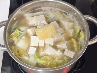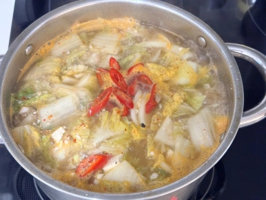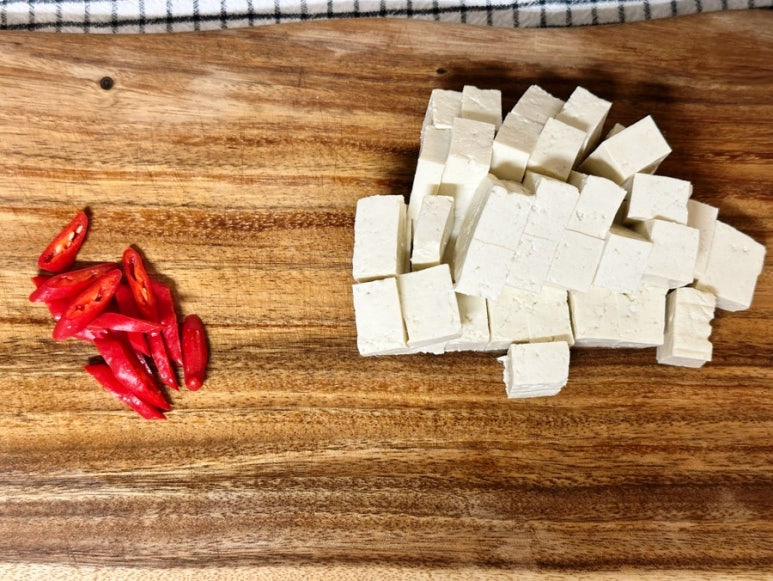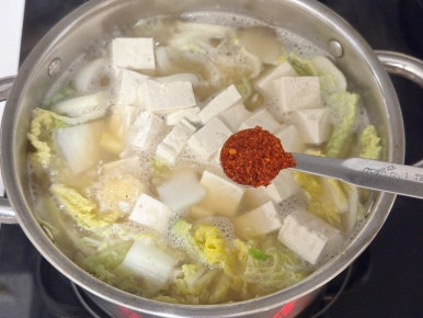 알배추 1개 , 두부 1개 , 집된장 2T , 물 150ml , 코인육수 2개 , 홍고추 1개 , 대게백간장 1T , 다진마늘 1T , 고춧가루 1t