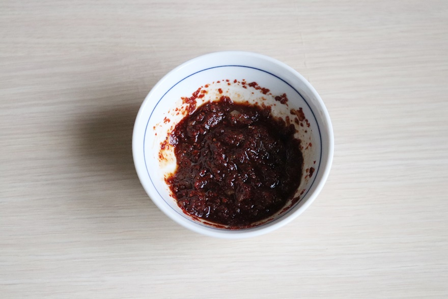 양조간장 2 큰술 , 고춧가루 1.5 큰술 , 설탕 0.5 큰술 , 다진 마늘 1 큰술 , 참기름 1 큰술 , 후추 약간
