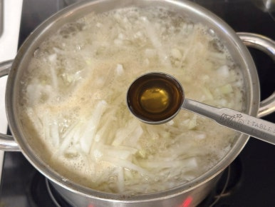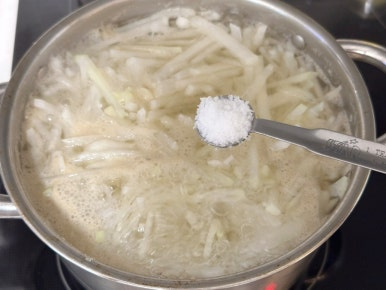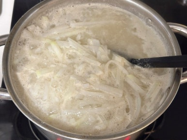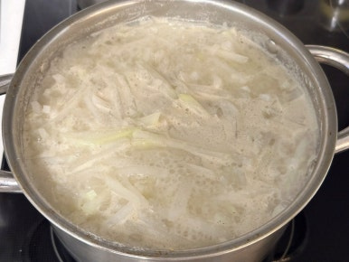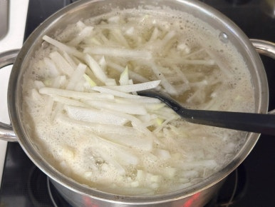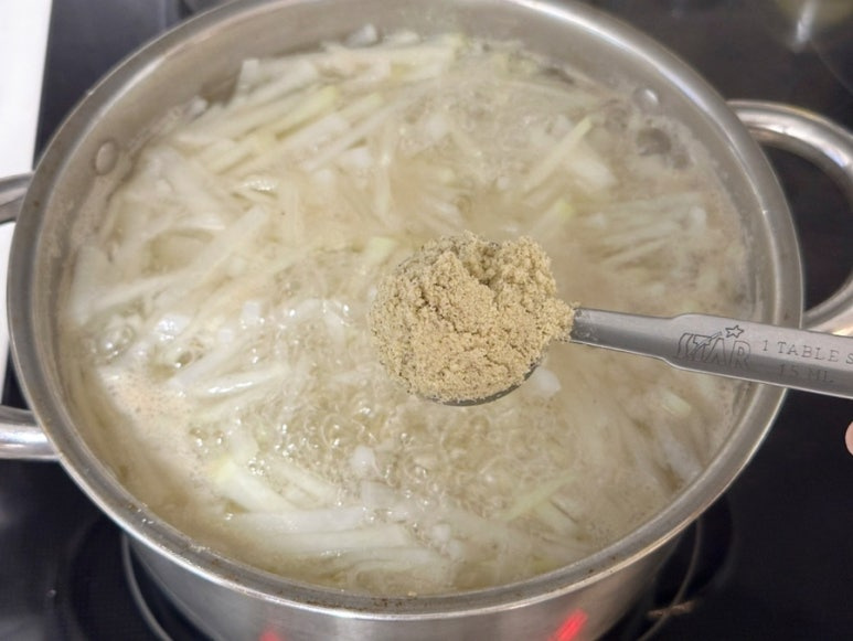 무 800g , 물 1.2L , 코인육수 2개 , 들깨가루 3T , 대게백간장 1.5T , 소금 1t
