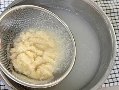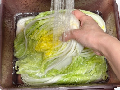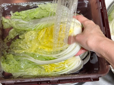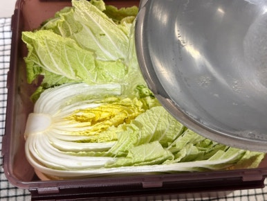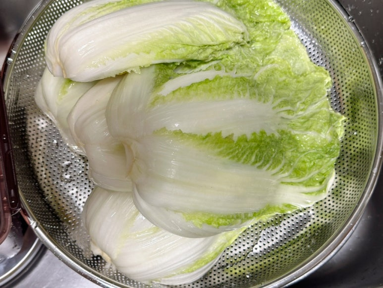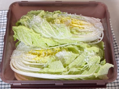 배추 3포기 , 물 2L , 굵은소금 300ml , 찹쌀물 2L , 배 1/2개 , 사과 1개 , 무 200g , 양파 1/2개 , 쪽파 (한줌), 당근 30g , 홍고추 1개 , 대추 3개 , 마늘 10개 , 생강 1개 , 새우젓 1T , 소금 1T