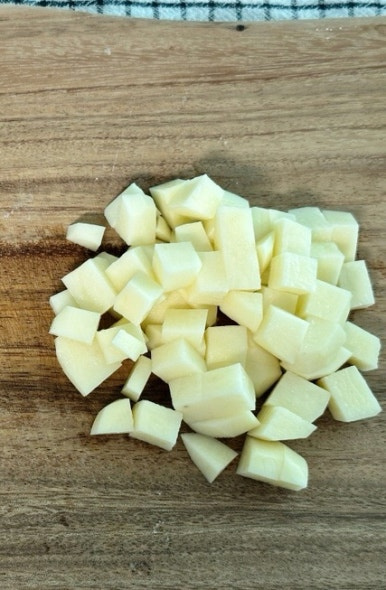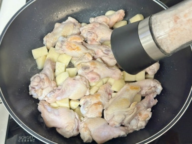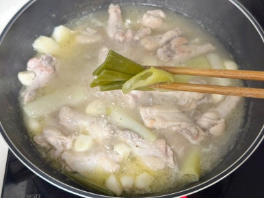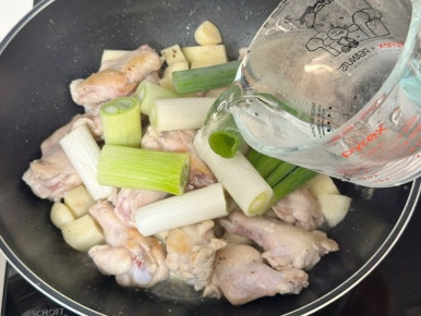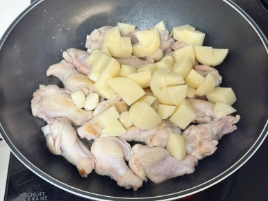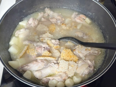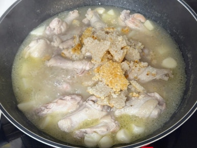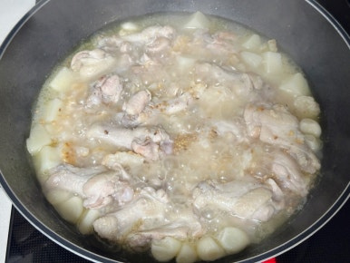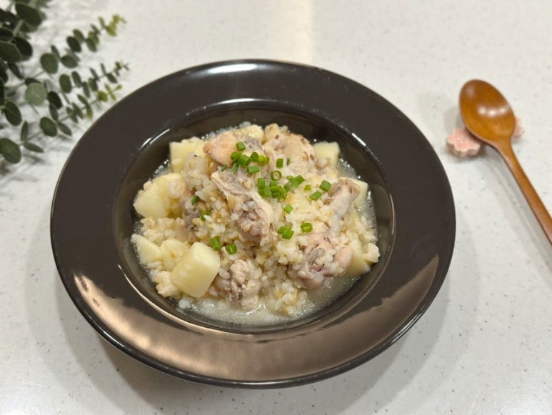닭봉 600g , 감자 2개 , 대파 1개 , 마늘 15개 , 누룽지 300g , 물 1.2L , 올리브유 1T , 소금 1t , 후추 0.5t