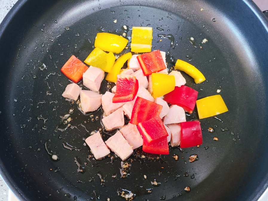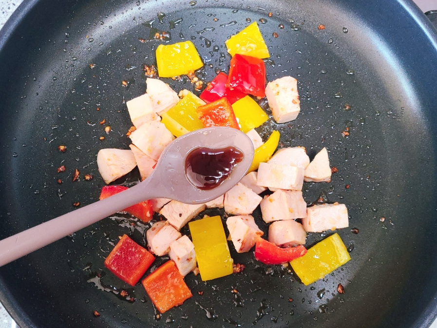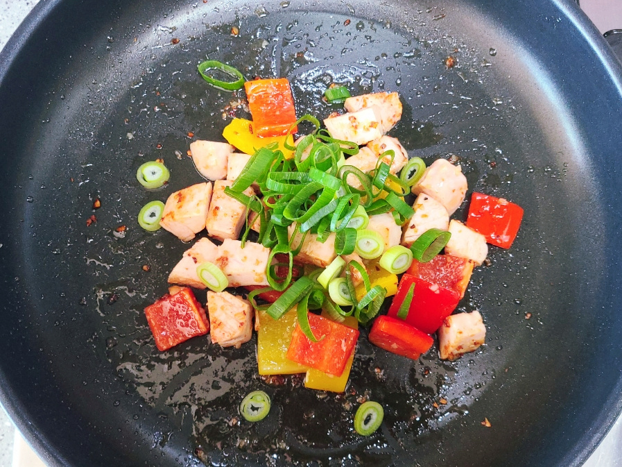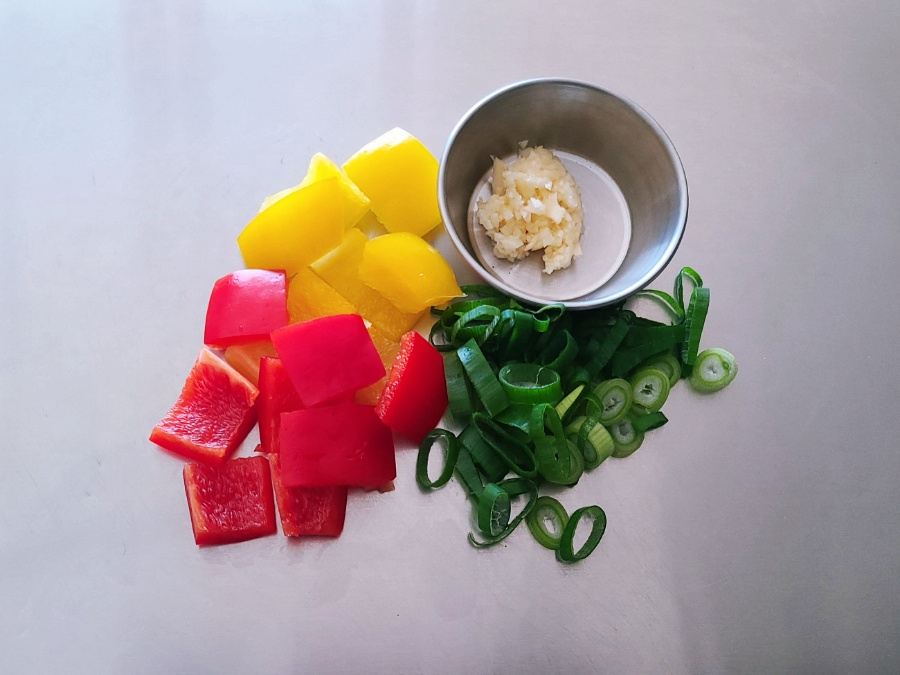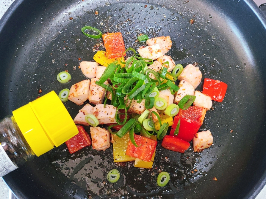 시판용 닭가슴살 100 g , 빨간 파프리카 30 g , 노란 파프리카 30 g , 대파 15 g , 다진마늘 0.5 큰술 , 굴소스 0.3 큰술 , 통깨 솔솔솔 , 후춧가루 톡톡톡 , 올리브오일 2 큰술