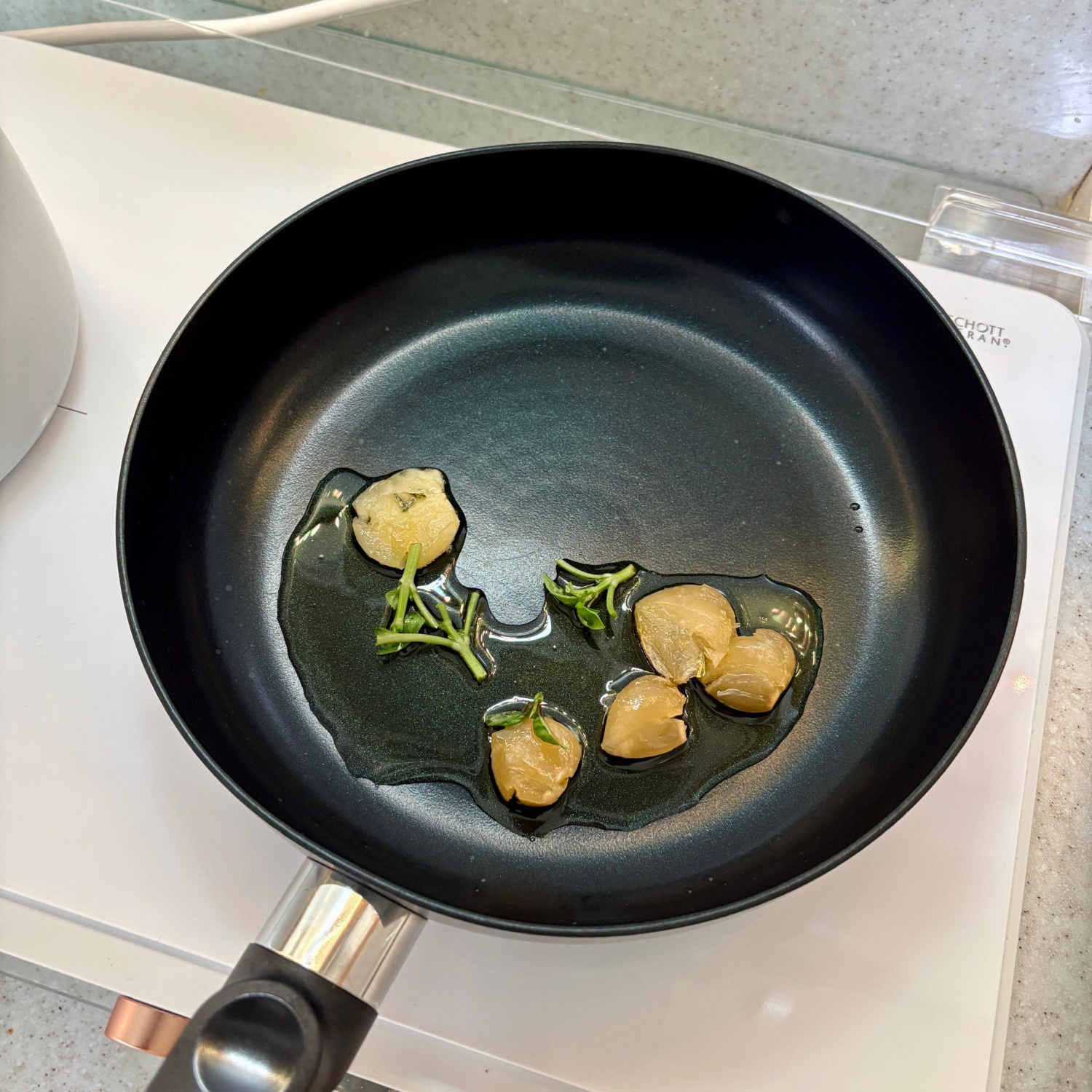 4. 만테까레시 팬을 불에서 띄워서 조금씩 올리브오일을 추가해 주세요.