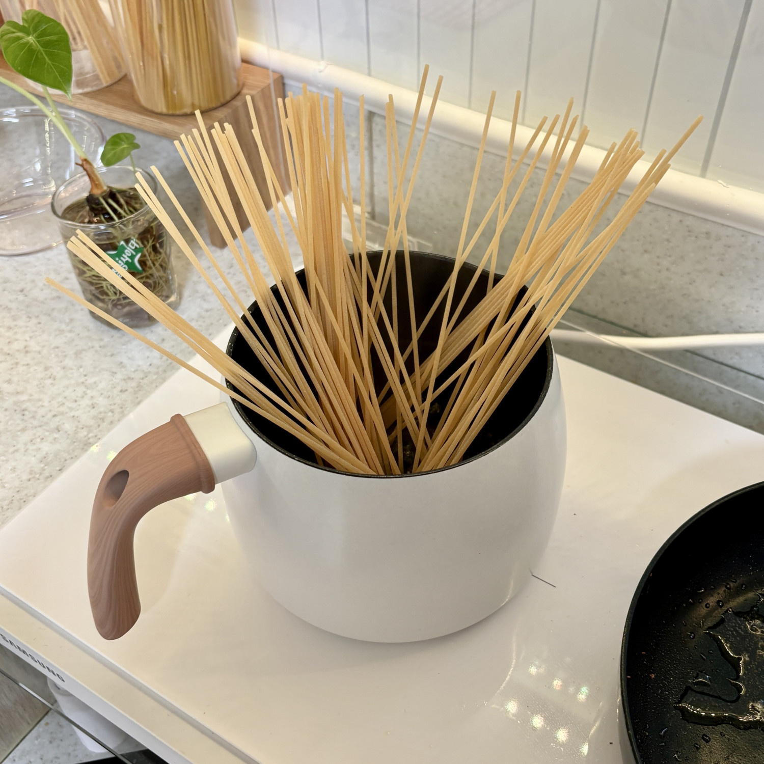 2. 소스가 어느 정도 만들어지면 면수 대신 생수(물)를 넣어서 농도를 잡아주세요.
