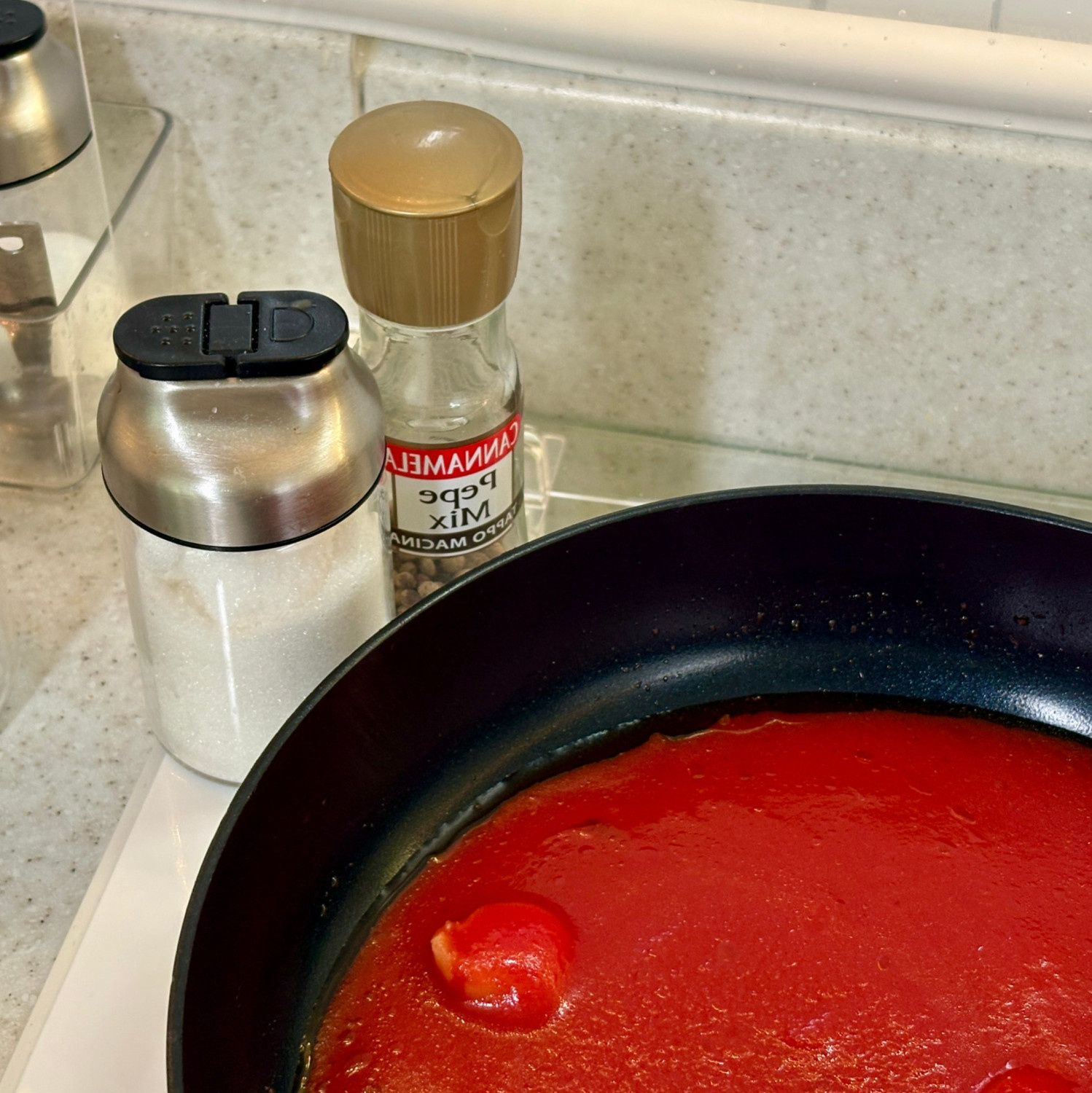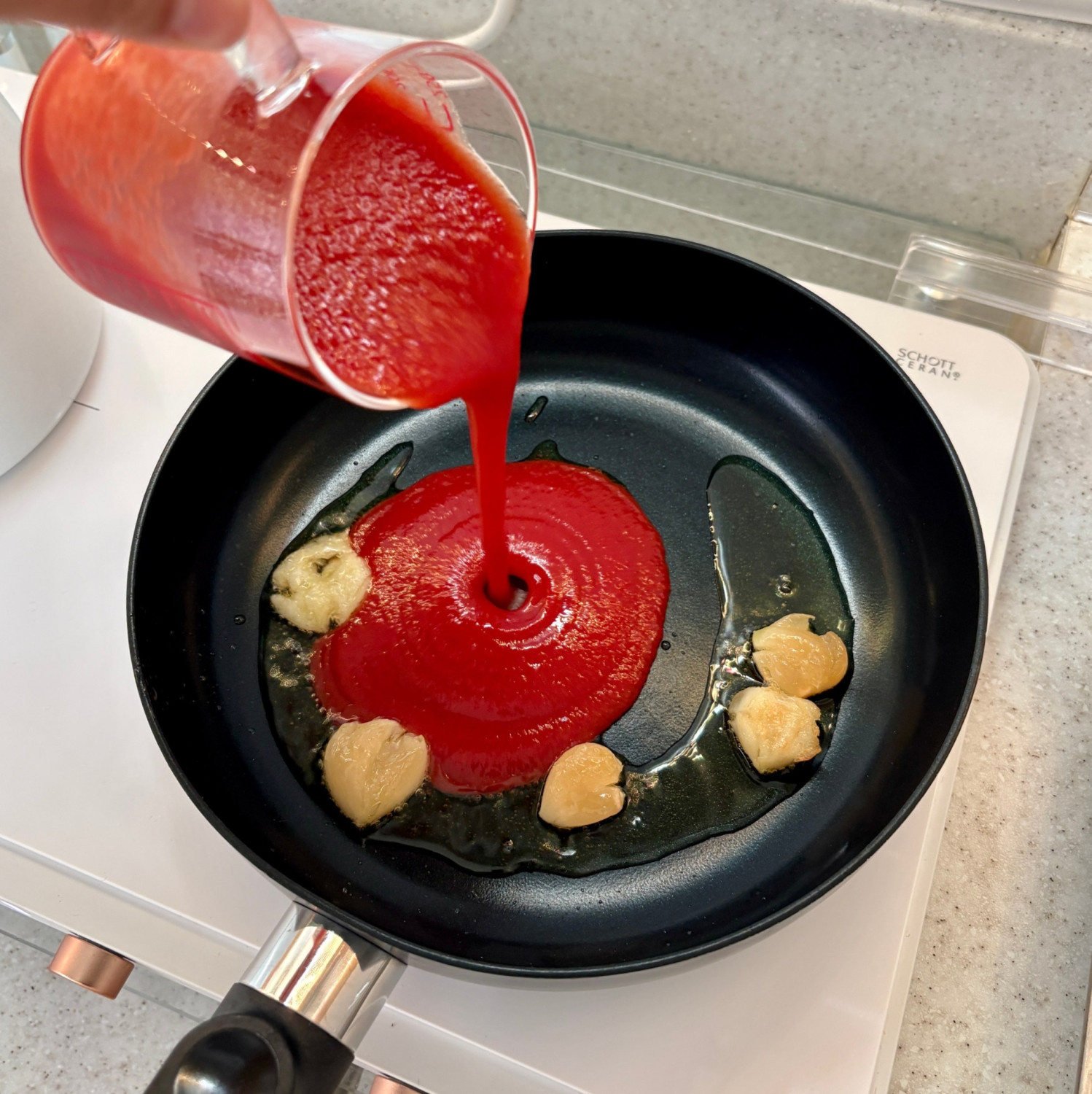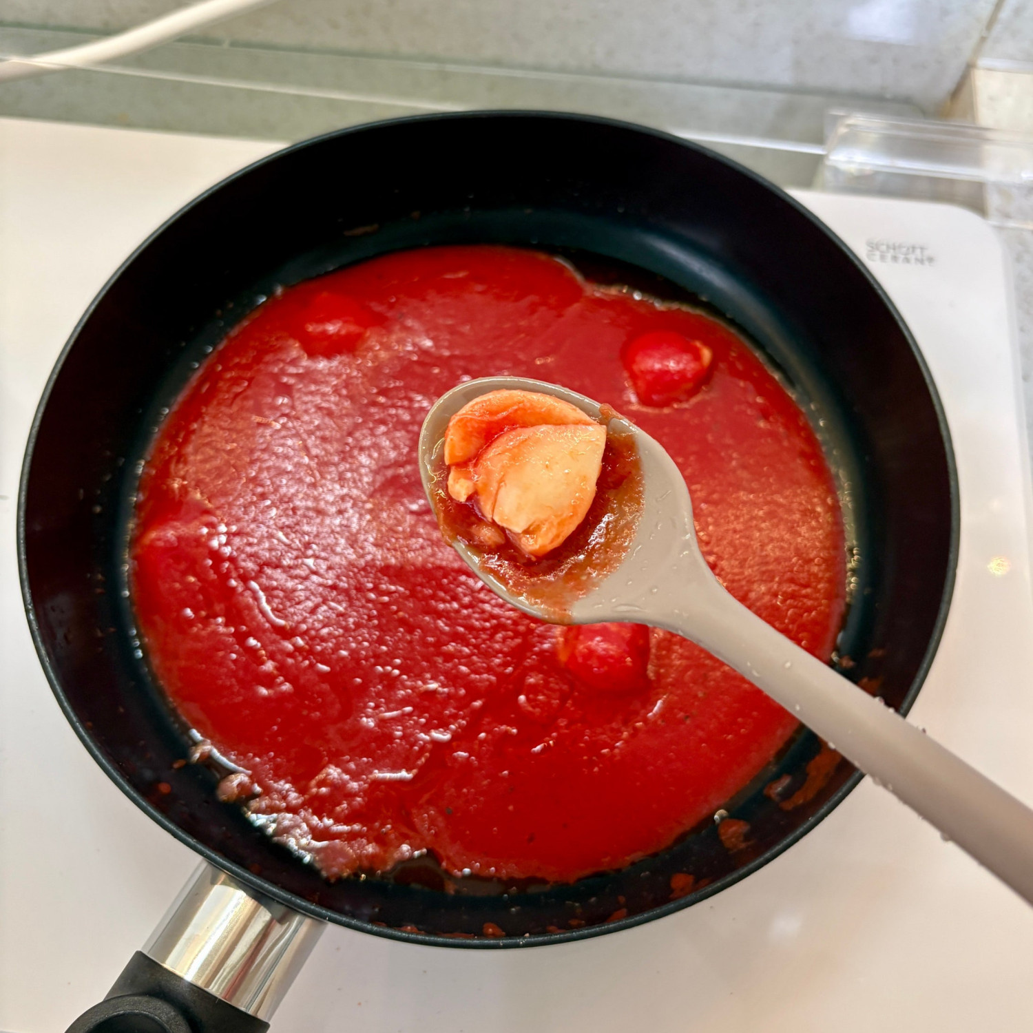 3. 토마토소스가 팬에 붙지 않게 긁어서 모아주세요.