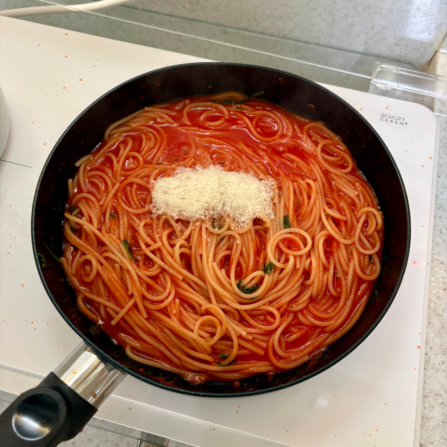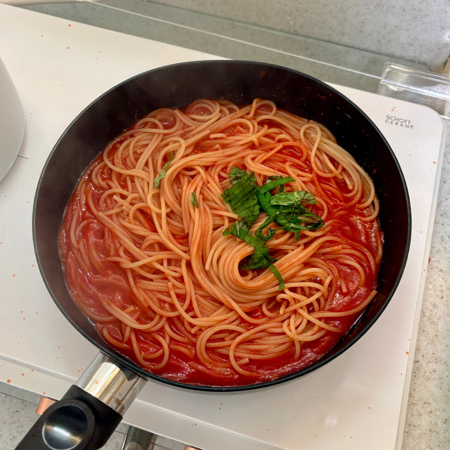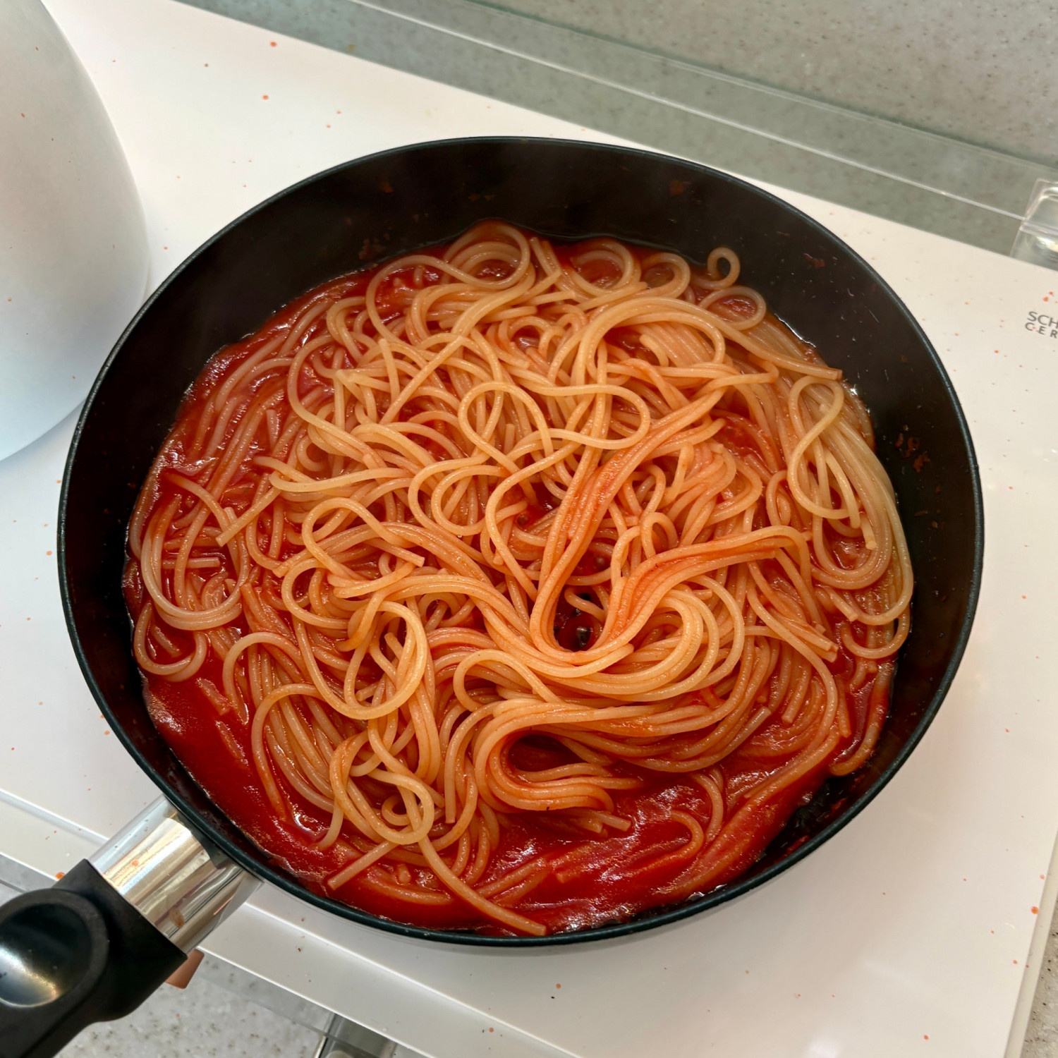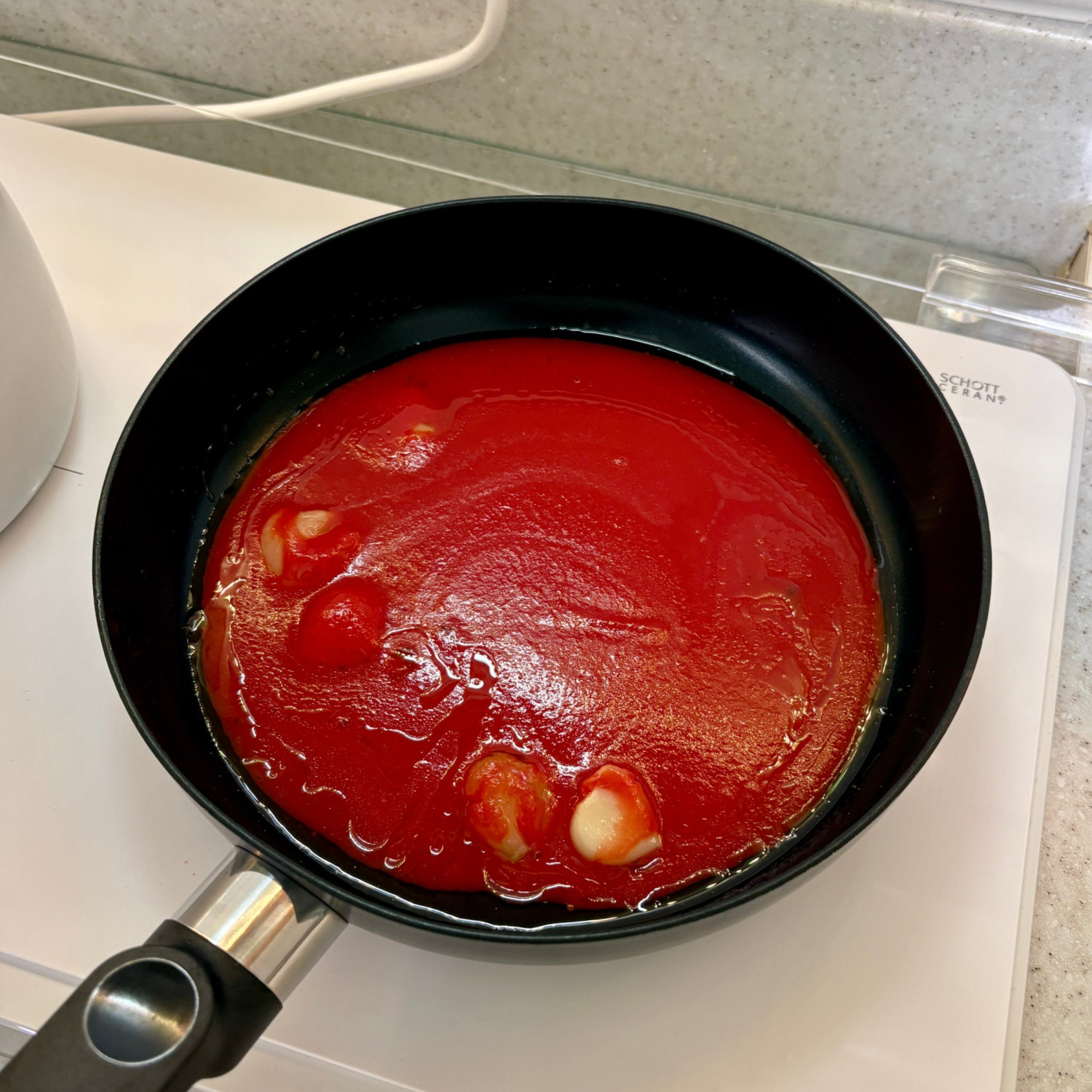 3. 토마토소스가 팬에 붙지 않게 긁어서 모아주세요.