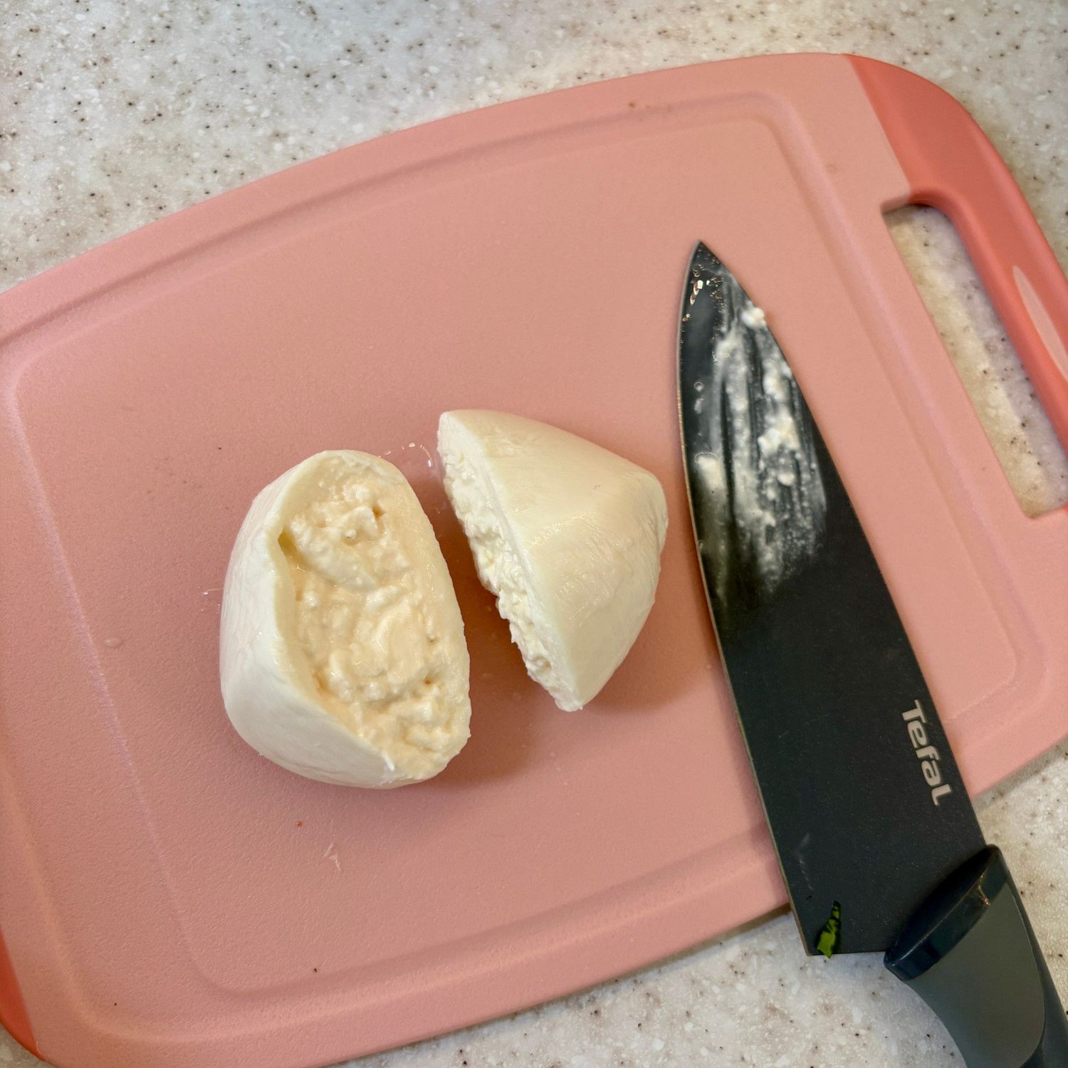 겉은 모차렐라 치즈이고 안쪽은 스트라차텔라라고 불리는 잘게 찢은 모짜렐라와 생크림이 섞여있어요!