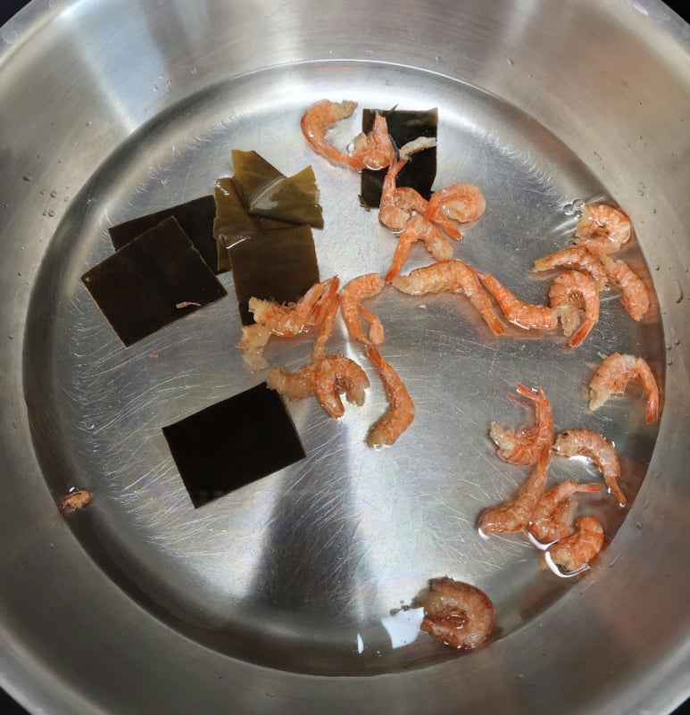 8. 밑국물 만들기 - 물 300ml에 다시마, 건새우 넣고 끓이기. (강불. 7분 정도)