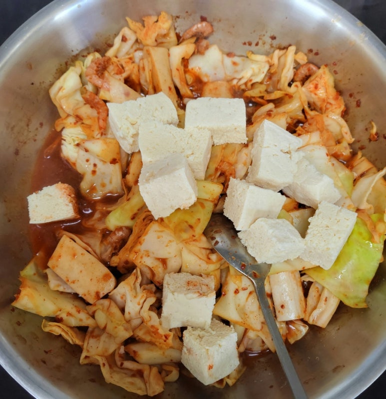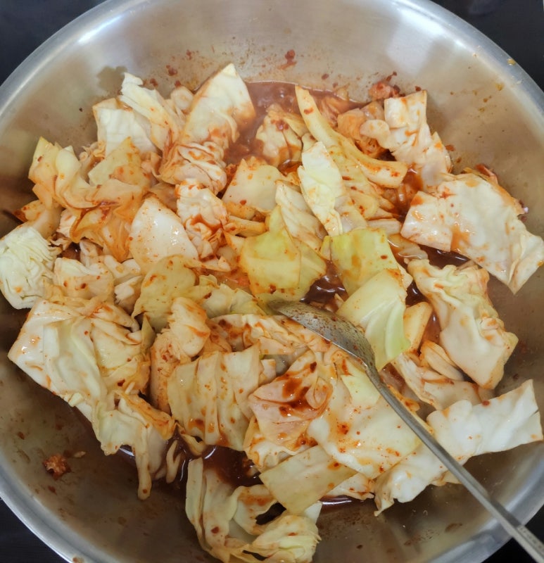 11. 양배추 넣기. (작게 썰면 조리 시간을 더 단축할 수 있어요~)