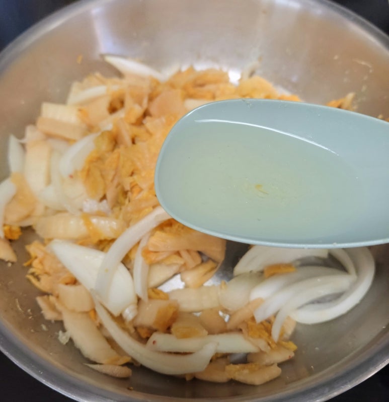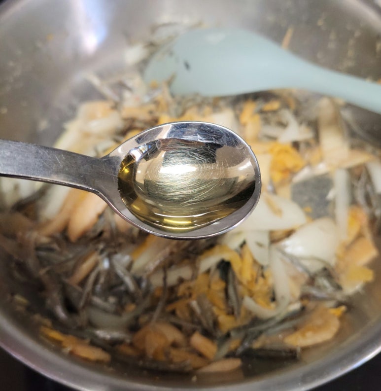 12. (오일은 더 넣지 않고) 멸치 국물 낸 것~조금씩 넣으면서 타지 않게 볶기.