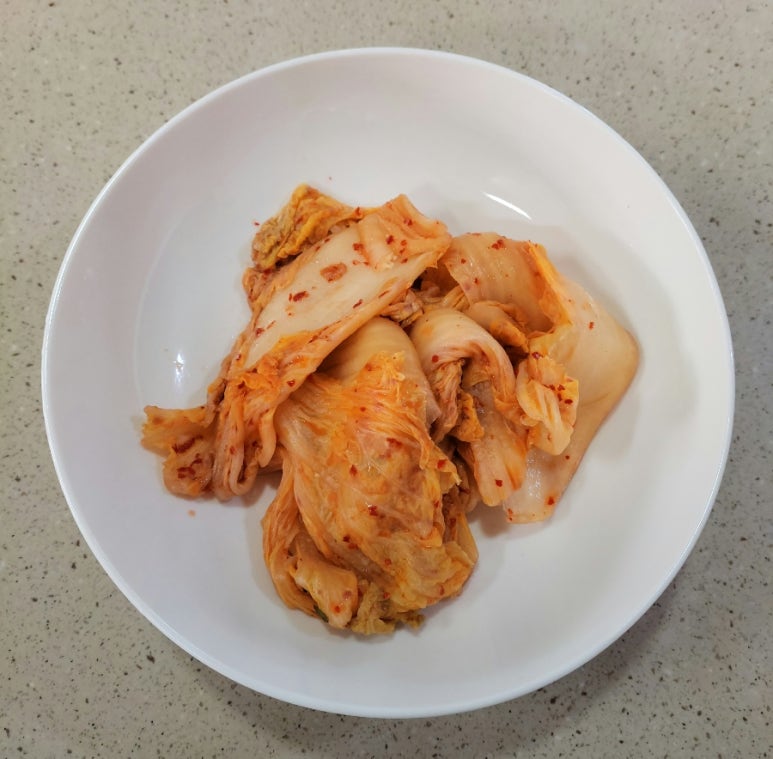 6. 물기는 적당히 짜낸 후, 묵은 김치 200g 정도 준비하기. (양념도 걷어내고~)