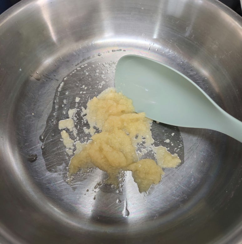 9. 달군 팬에~ 오일 살짝 두르고 간 마늘 1T 볶기.(약불. 2분 정도)