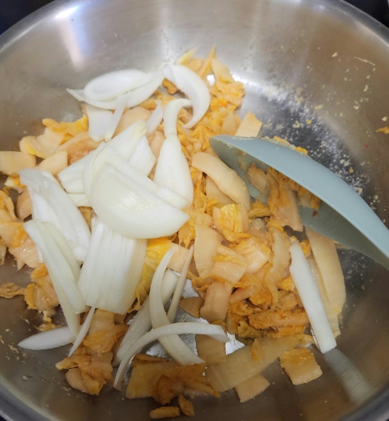15. 불 끄고, 다진 파 넣고 잔열로 볶기.(1분)