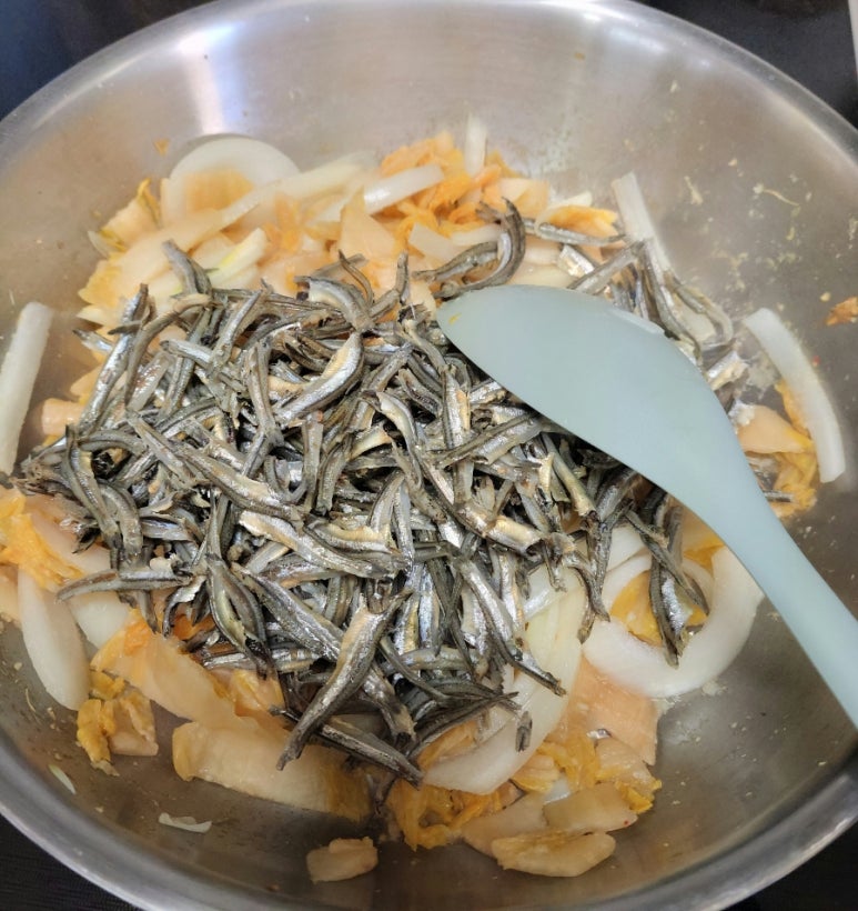 13. (3분 삶아서 미리 건져둔) 멸치 넣고 같이 볶기.(중불 2분 정도)