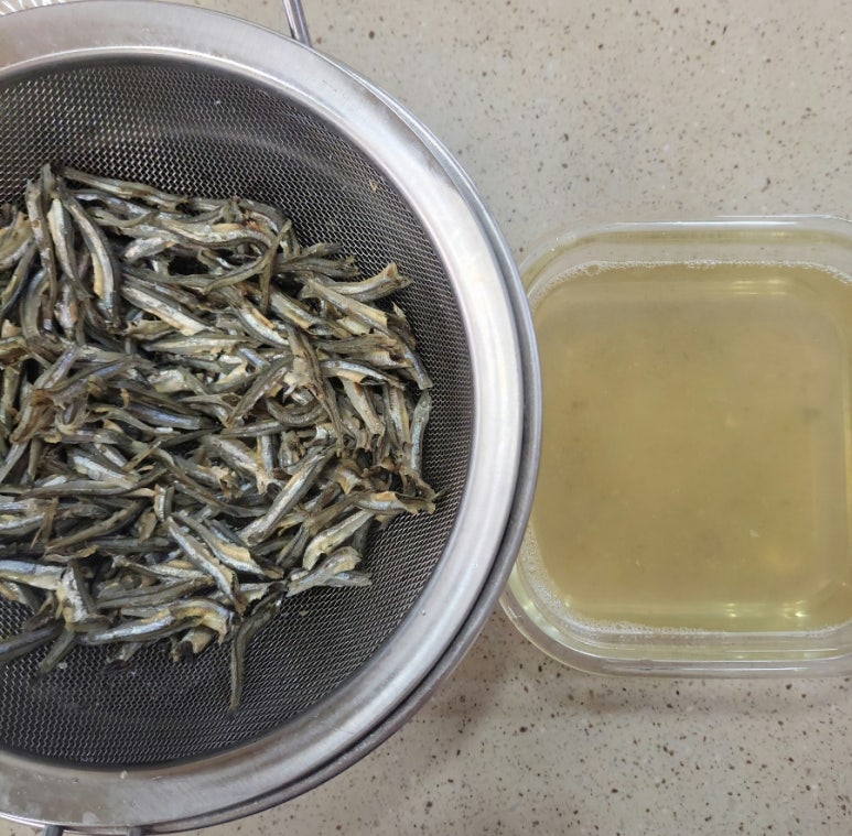 5. 살짝 삶아낸 멸치와 그 멸치의 육수는 따로 분리해서 담아두기.