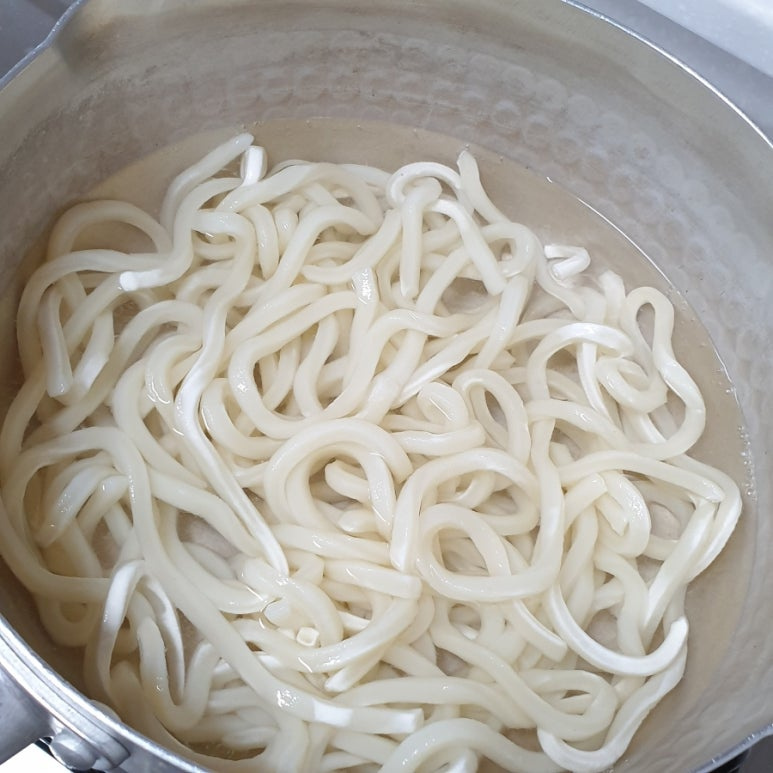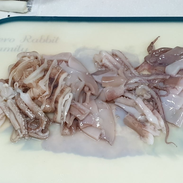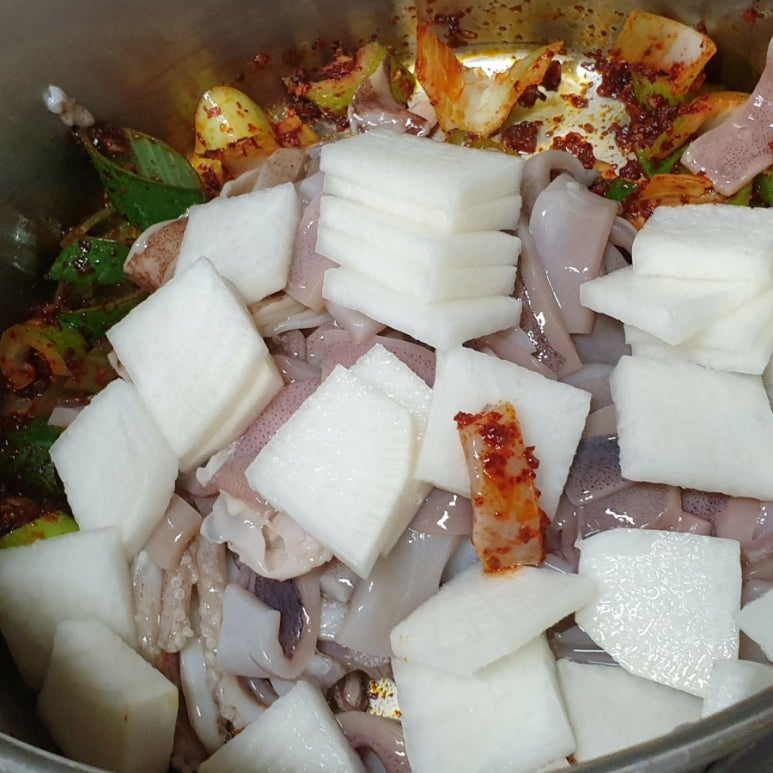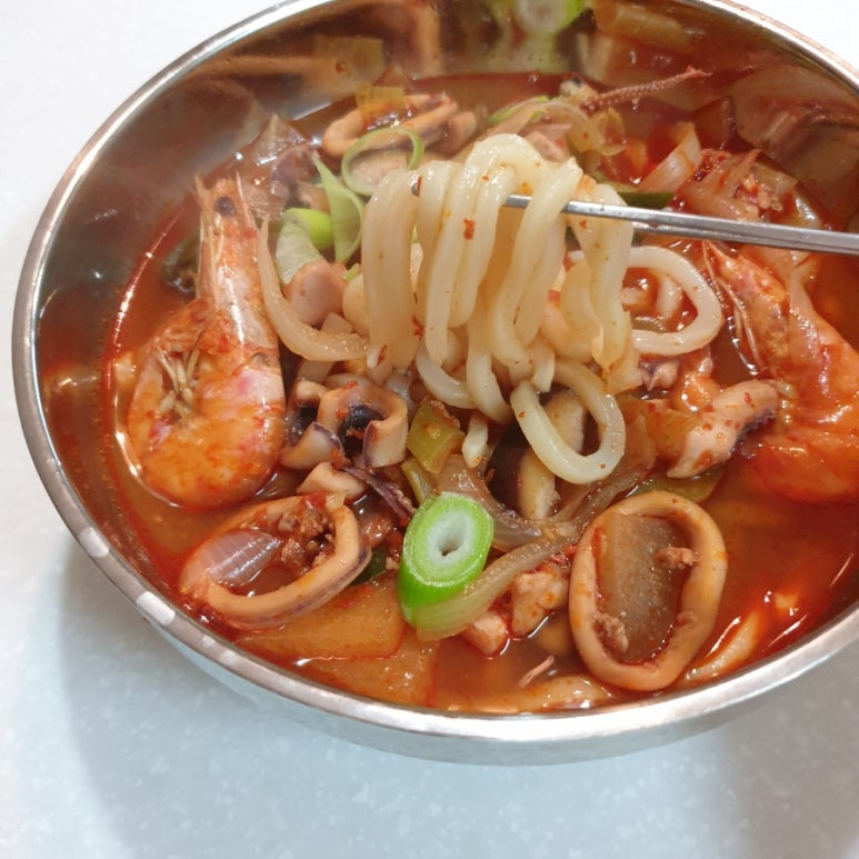 오징어 3마리 , 새우 4마리 , 우동사리 , 대파 1대 , 무 1/5개 , 양파 반개 , 표고버섯 3개 , 식용유 4스푼 , 물 1.5리터