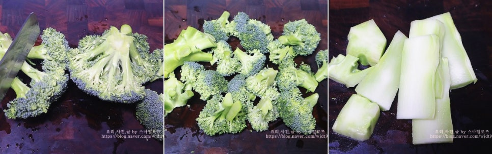 송이송이를 잘라주고 기둥도 껍질을 벗겨 먹기 좋게 잘라줍니다