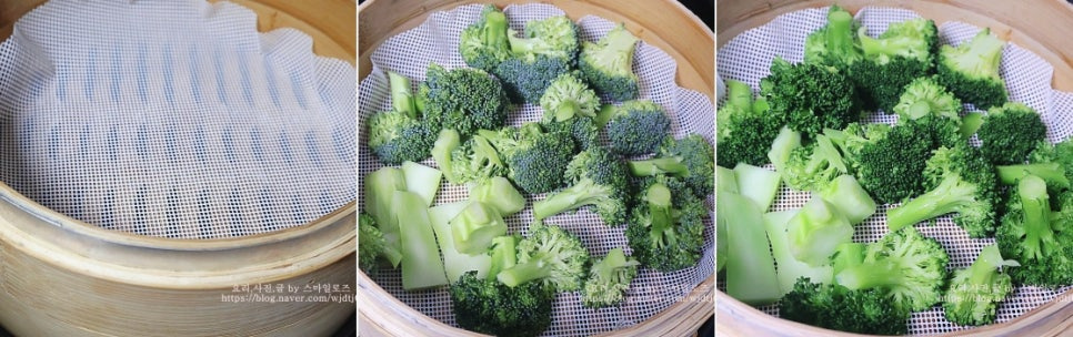 브로콜리를 올려주고 뚜껑 덮고 1분~2분 정도 찐 다음 송이는 꺼내고
