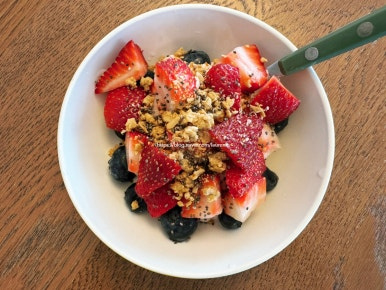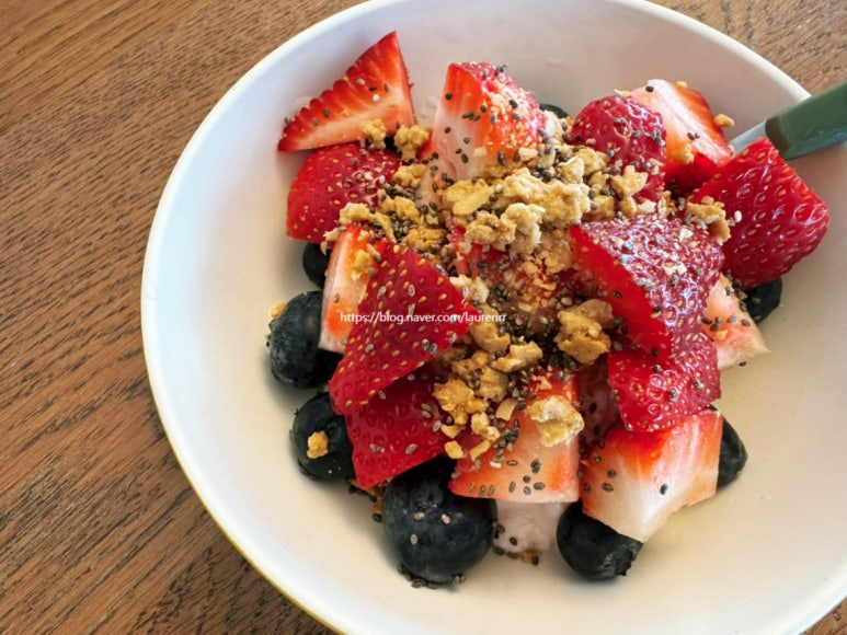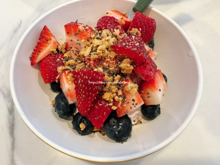 딸기요거트 5큰술 , 블루베리 몇알 , 딸기 몇알 , 그래놀라 조금 , 치아씨드 조금