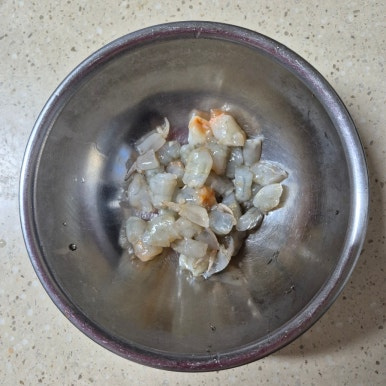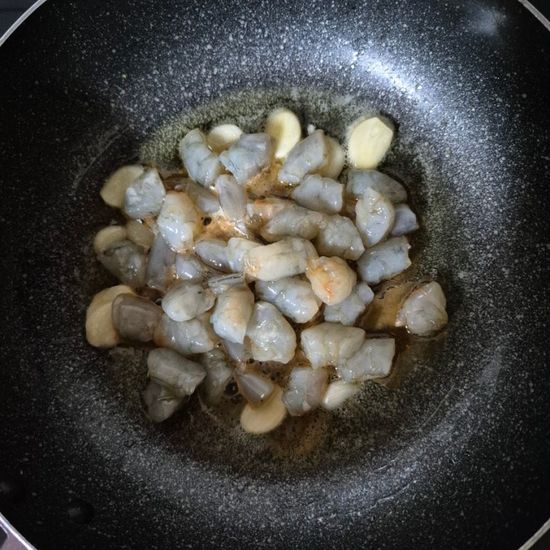 밥 2 공기 , 양배추잎 2 장 , 새우 10 마리 , 마늘 5 알 , 굴소스 1 큰술 , 쯔유 1 큰술 , 맛술 1 큰술 , 무염버터 1 큰술