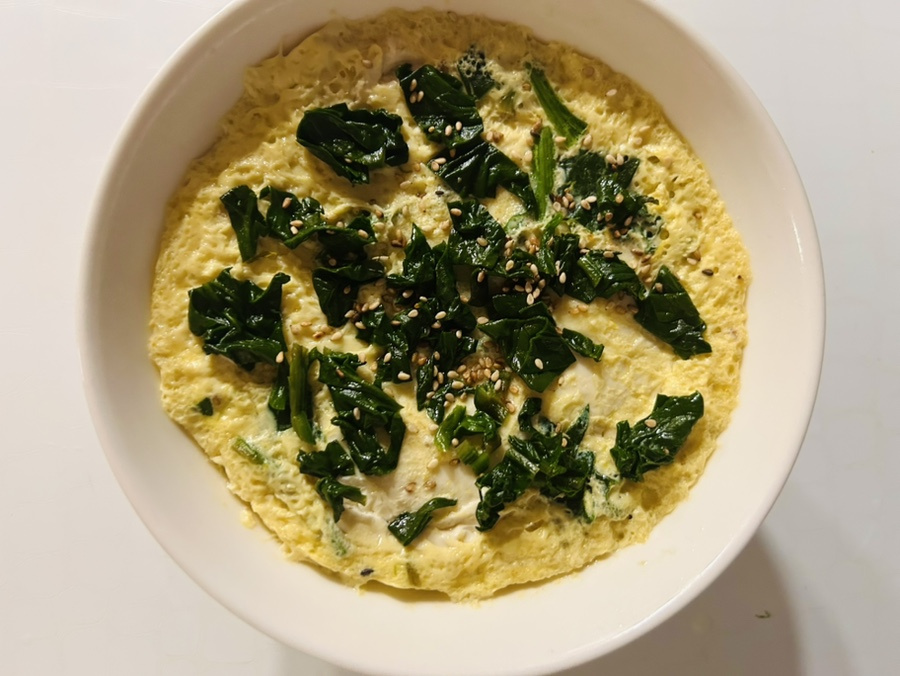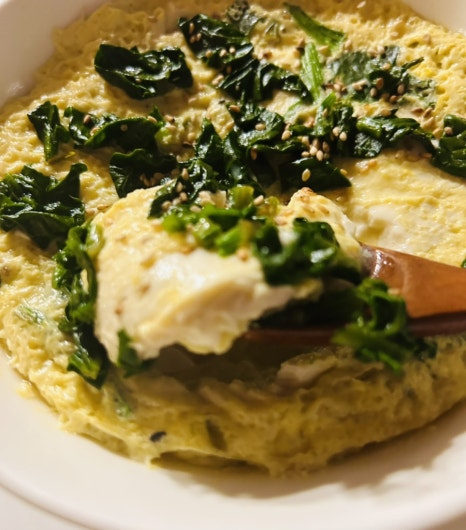 멸치 다시마 육수와 계란과 순두부를 넣어서 든든하게 한끼 식사 대용으로 먹을 수 있게 간도 약하게 하고 초록 겨울 시금치를 데쳐서 나물처럼 무쳐준 뒤 잘게 썰어 넣고 만든 계란찜이라 소화에도 좋고 간단한 요리지만 영양도 균형이 잘 맞아서 밥 대신 한끼 식사로 먹어도