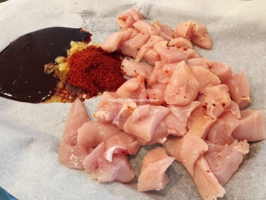 매콤한 양념에 닭가슴살을 큼직하게 썰어주고