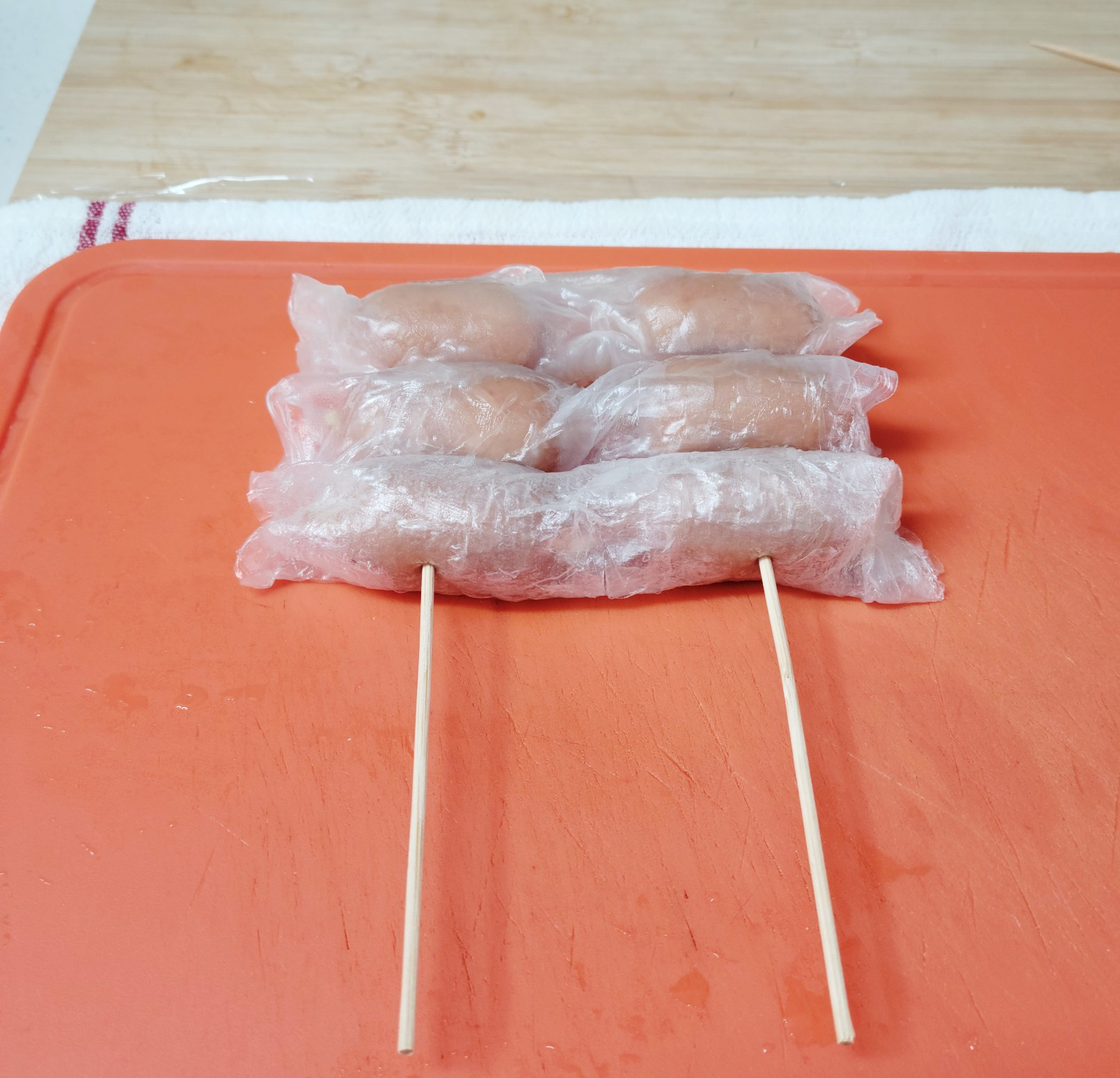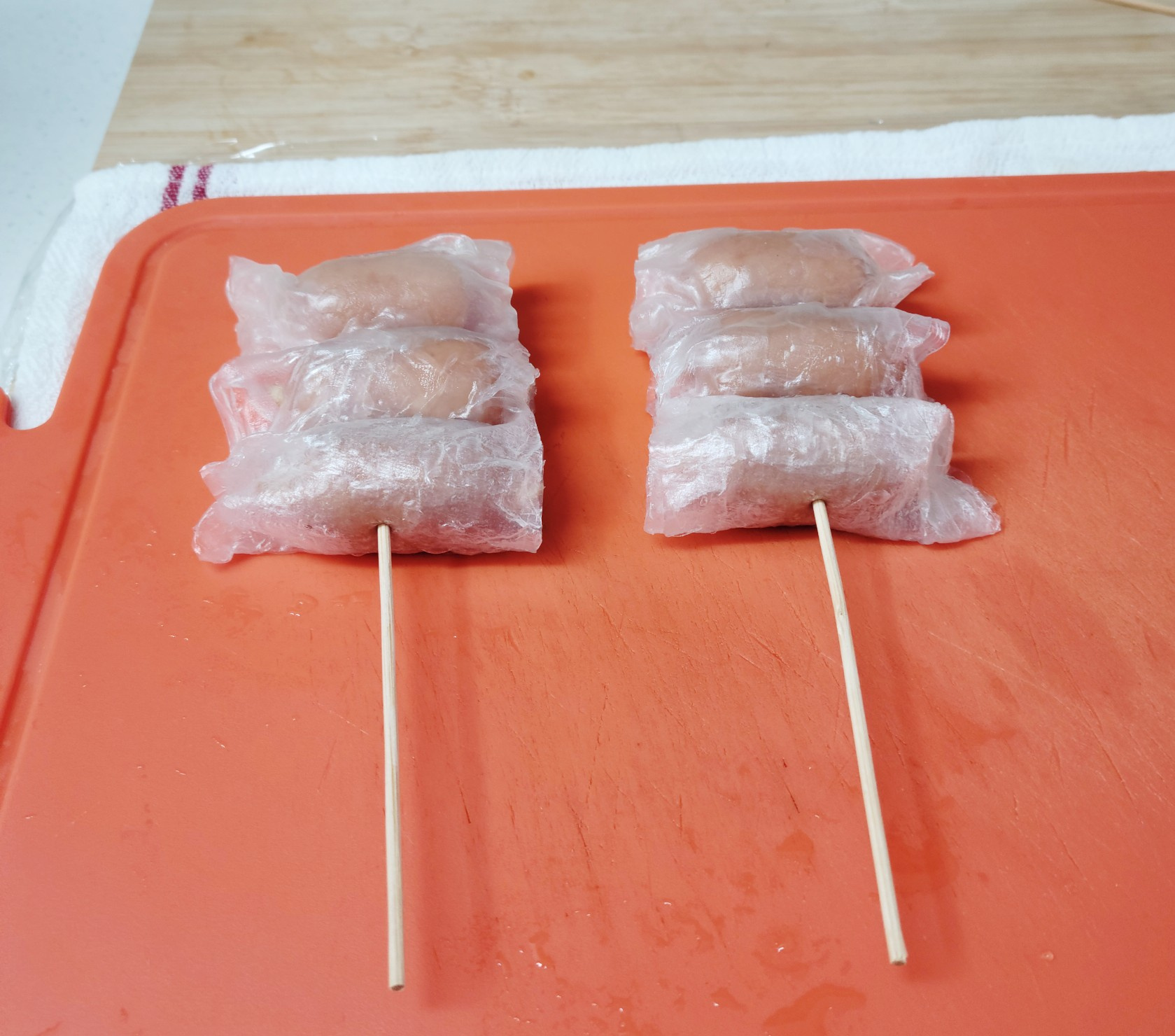 비엔나 소세지 9개 , 라이스페이퍼 , 오일 , 꼬치 , 소스: , 초고추장 1T , 메이플시럽 1T , 깨
