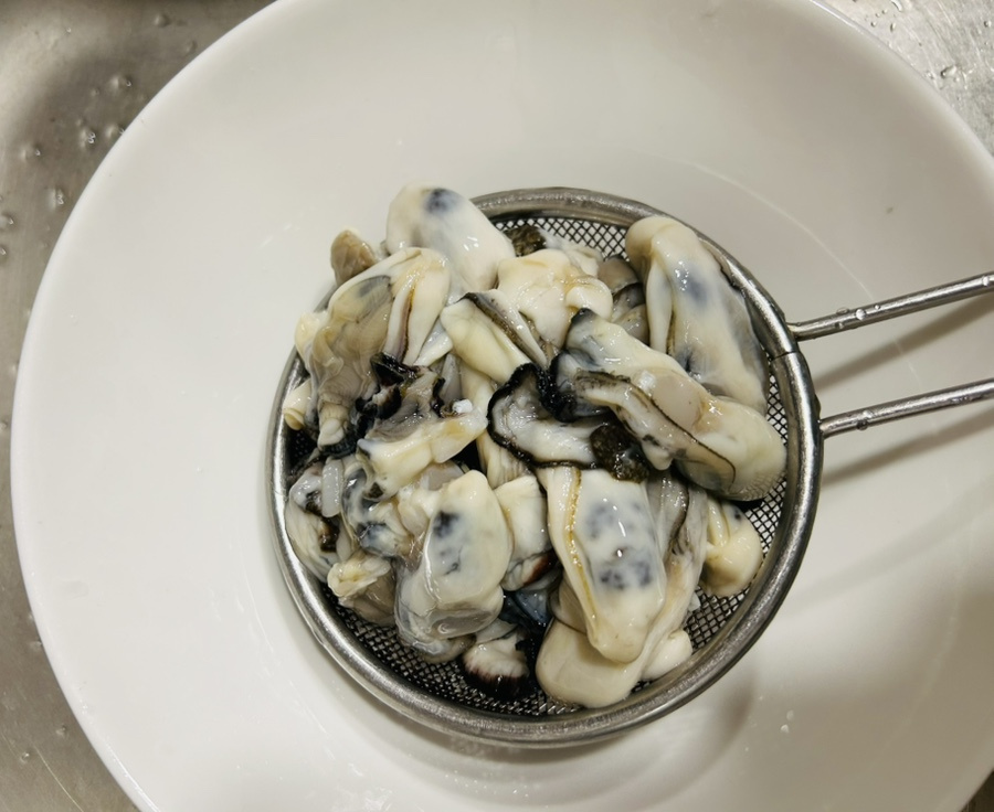 신선한 굴을 골라서 소금물에 씻어 헹궈 놓고 물기를 빼주면 재료 준비는 끝이죠.