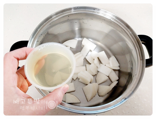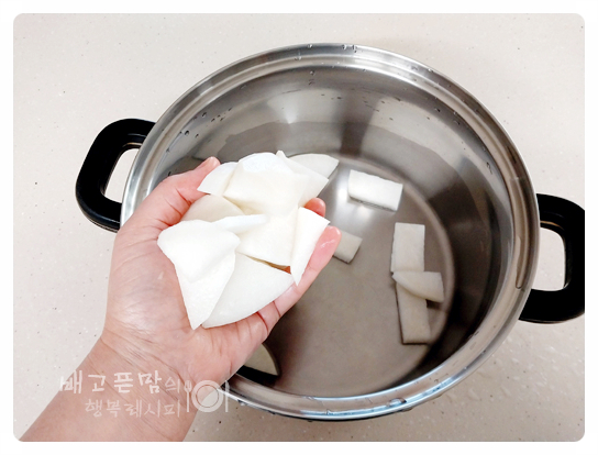 0.5cm 두께로 자른 무를 한 입 크기로 잘라