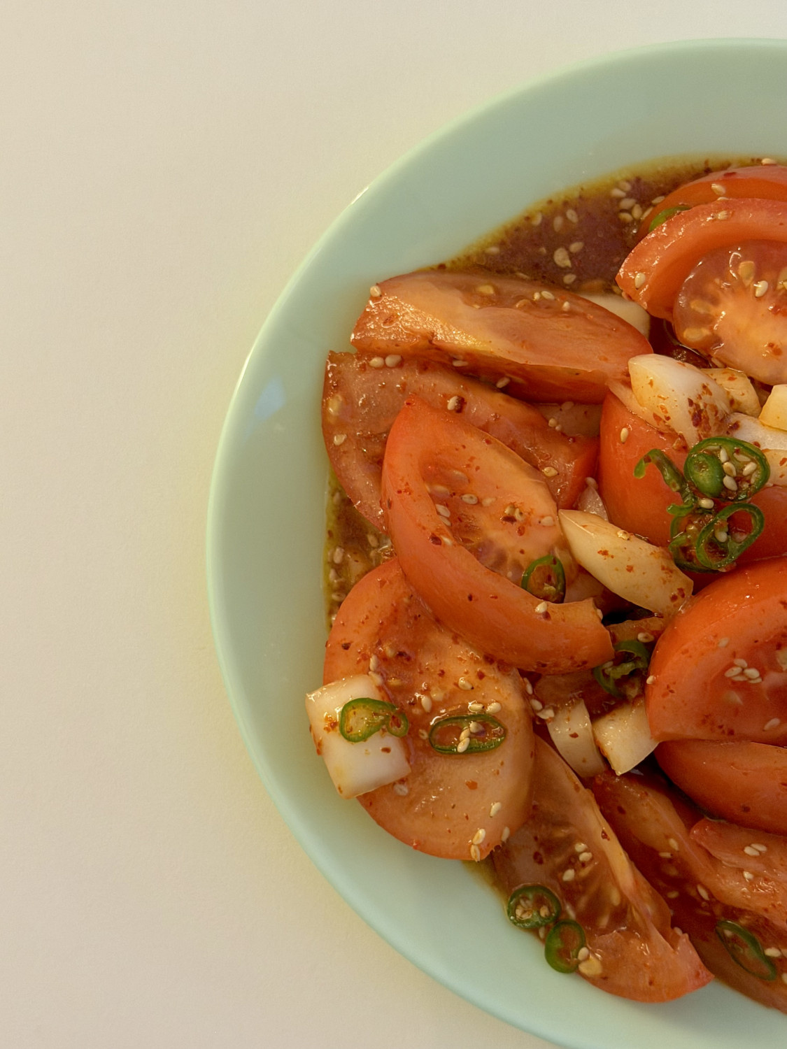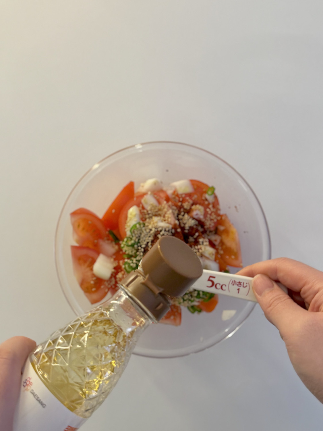 고춧가루 2t, 참치액젓 3t 올리고당 2t, 올리브유 3t 참깨 1t