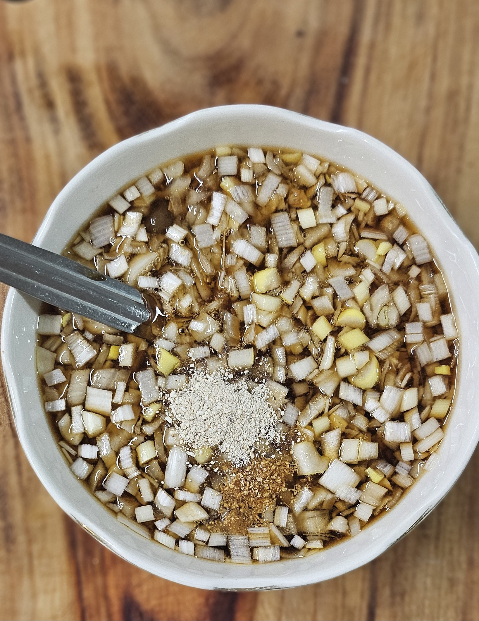 진간장 1 큰술 , 집간장 1 큰술 , 참치액 1 큰술 , 매실청 2 큰술 , 다진마늘 1 큰술 , 표고버섯가루 1/2 ts , 생강가루 1 g , 소주 1 큰술 , 올리고당 1 큰술 , 참기름 1 큰술 , 깨 1 큰술